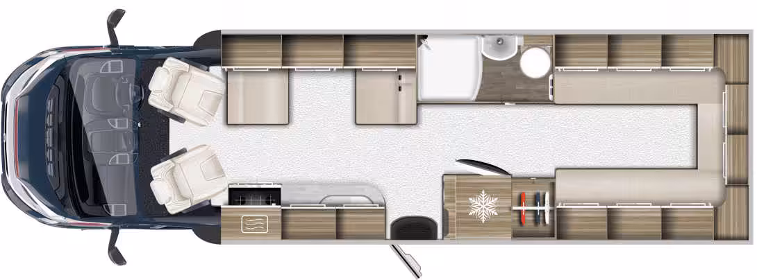 The Dream Drive KumaQ is a compact and efficient campervan layout that includes essential amenities for shorter trips. Its size and simplicity put it at the more affordable end of the RV spectrum for families, but don’t let this fool you. The Japanese craftsmanship on the KumaQ gives this campervan a boutique feel.