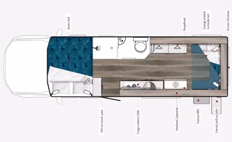 The Winnebago Coogee is a luxurious motorhome designed for comfort and functionality. It features an electric slide-out main bed to expand the sleeping area, a large rear ensuite, and high-end appliances.