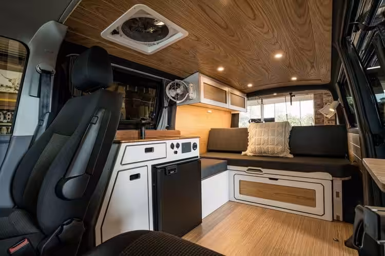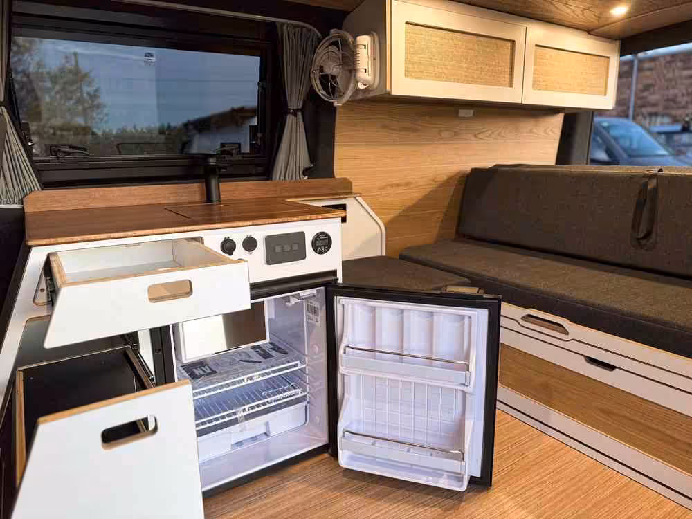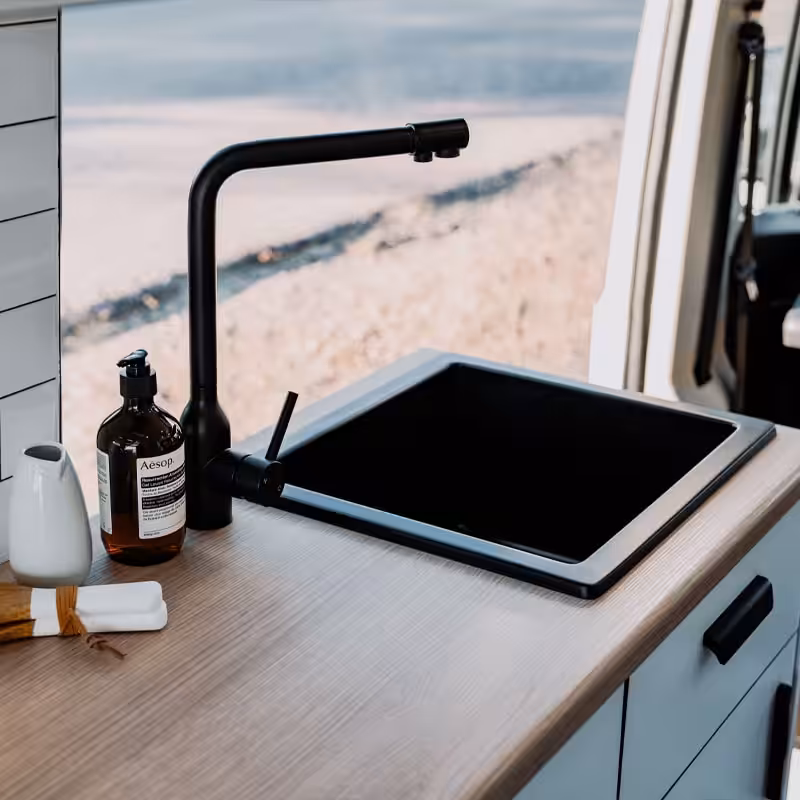 The Gleehawk Explorer Luxe is a gasless, fully electric campervan suitable for couples or singles. Featuring natural-grain timber that contrasts with the black cabinetry and hardware, it has more of a bespoke style than many other campervans for sale in this price bracket.