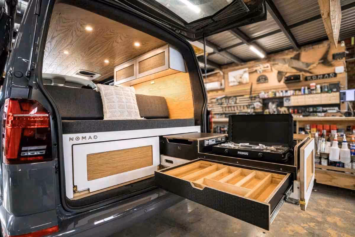 Suitable for couples or singles, Nomad’s Highland Campervan features a modular sofa/Queen-size bed, American Oak finish on the walls and ceiling, an interior kitchen with a 65L fridge, sink and storage, and an exterior kitchenette and shower.