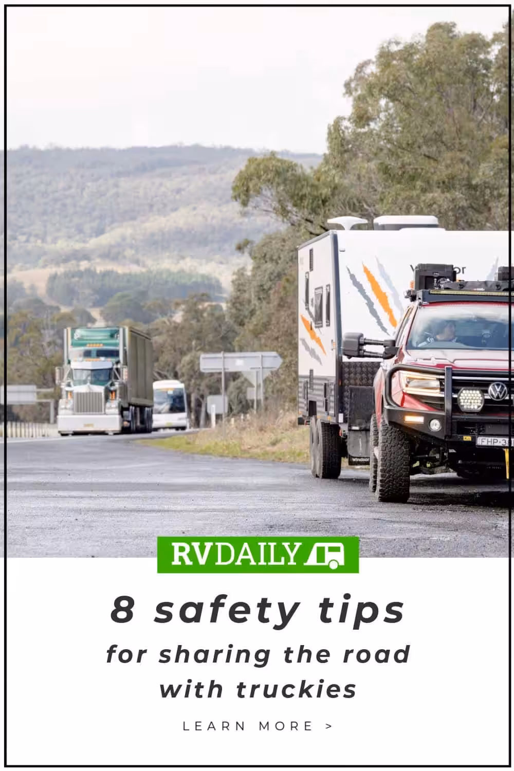Communication is key to sharing the road safely with truck drivers. Get yourself a UHF and learn how to communicate with not only truckies but other RVs in your convoy. More information on how to communicate with both trucks and RVs via UHF can be found in the RVSafe handbook, which you can get sent to your email for free by completing the form below.