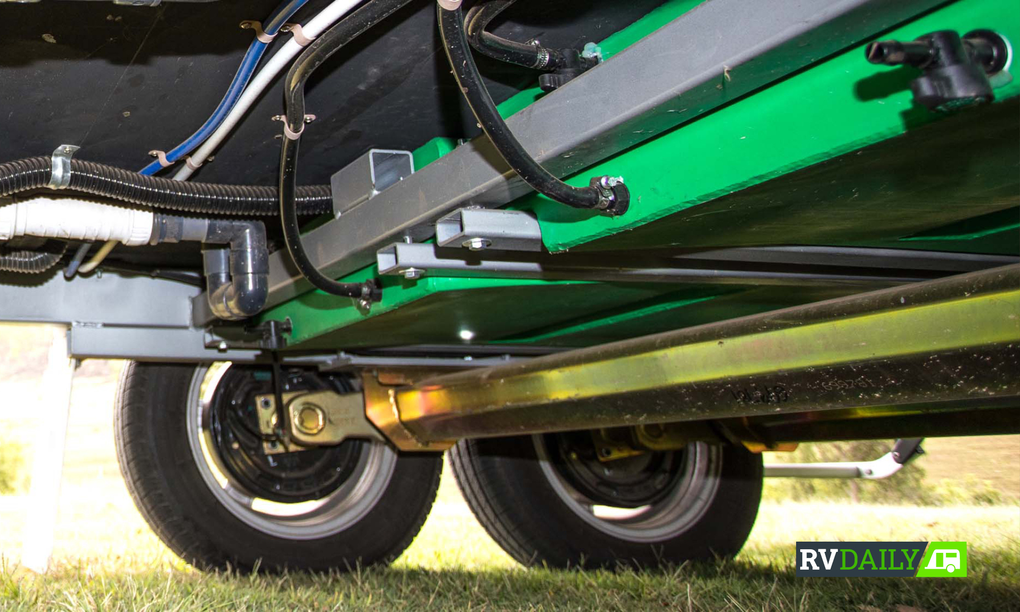 A 12V radio is housed in one of the front overhead lockers with two speakers inside and two outside. The battery can be optioned to be either 120Ah or include an additional 100Ah AGM battery. The battery is housed in a locker beneath the floor at the foot of the bed to keep the weight centrally located. I was concerned, however, when I looked underneath the van that it could take a hit from rocks or other obstacles.