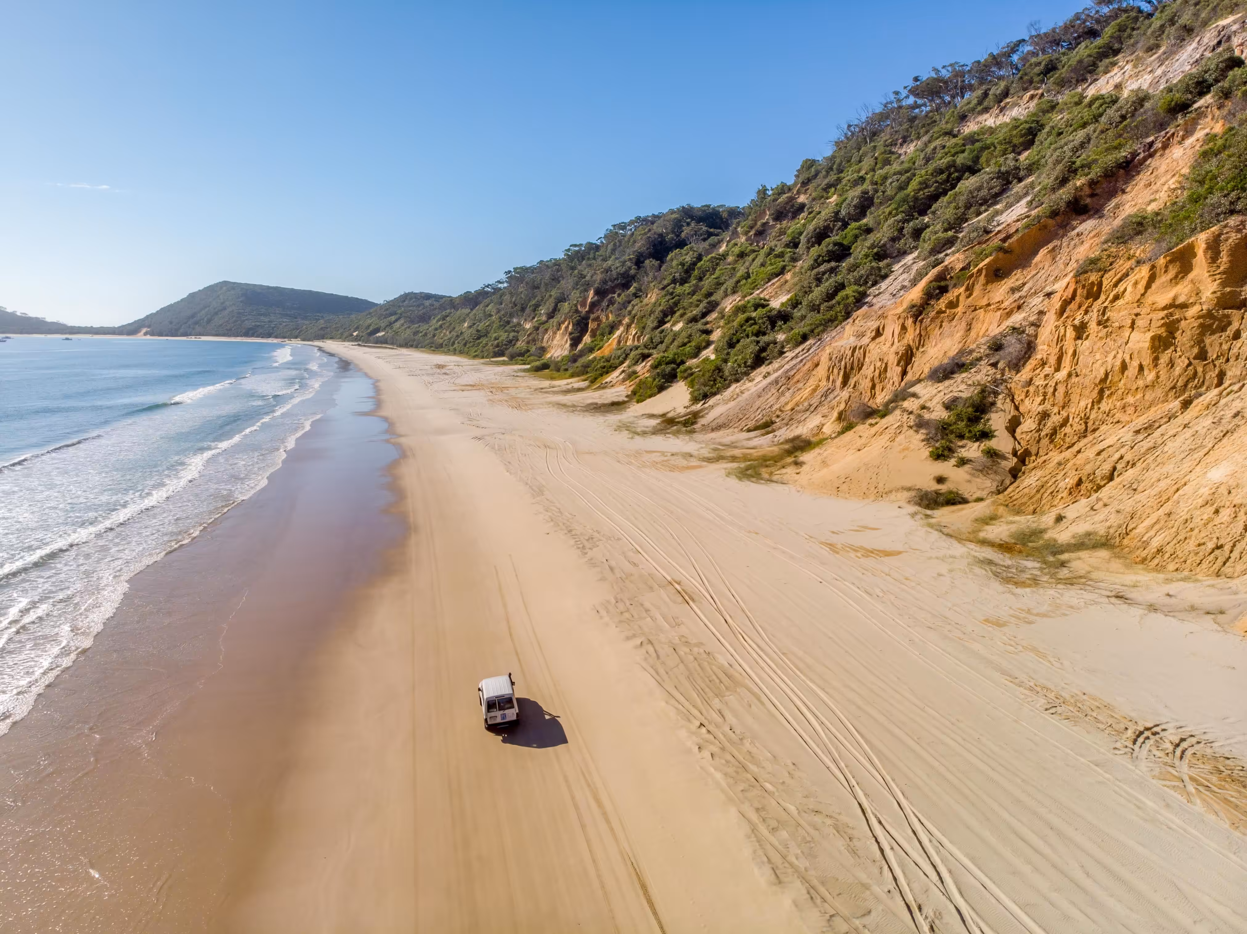 Another cracker coastal drive, only this one has a twist. It’s literally on the beach and accessible to 4WDs only. If you’ve got an RV built for sand bashing, the Great Beach Drive should be high on your bucket list. Officially, the drive traces the water from Noosa on the Sunshine Coast to Rainbow Beach. Unofficially, it’s a 380km jaunt including an island hop over to K’gari and back again, pulling up stumps at Hervey Bay. Along the way you’ll pass through two UNESCO Biosphere Reserves – Noosa and Great Sandy – and the largest sand island on the planet, World Heritage-listed K’gari. The drive features some epic beach camps, secluded coves, riotously coloured dunes and a 150-year-old lighthouse. And that’s all before you get on the barge to K’gari, home to towering rainforests and the largest dune lakes in the world.