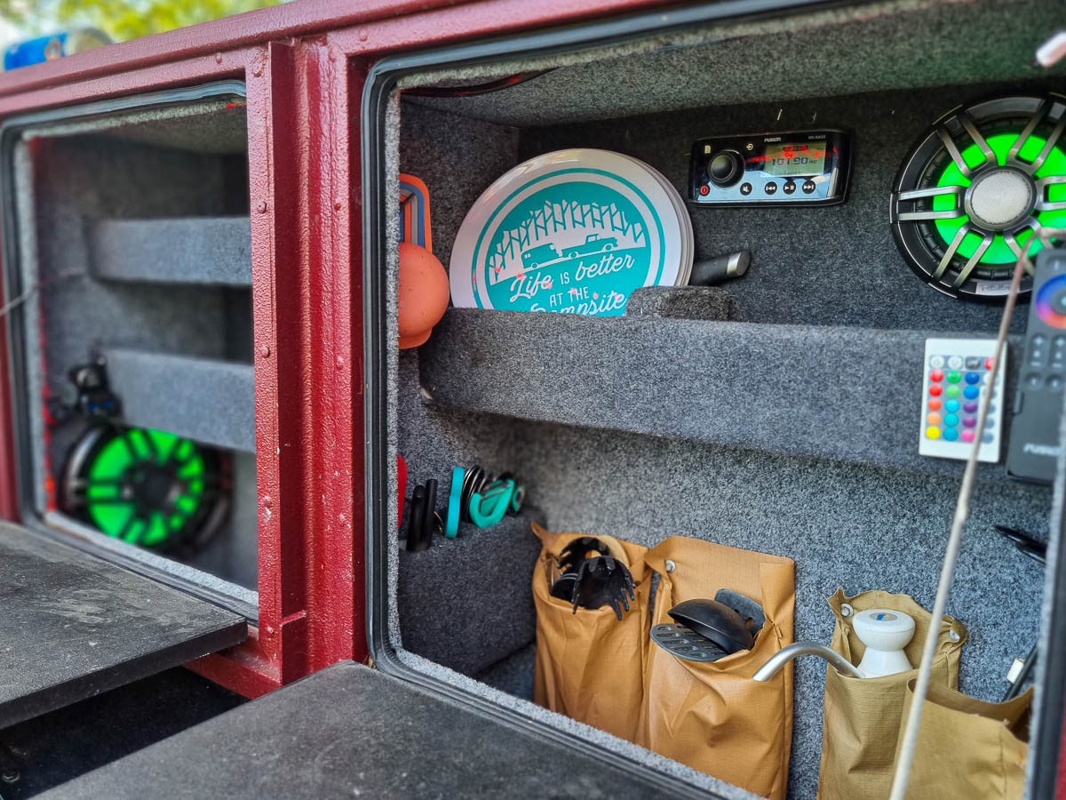 There are two compartments featuring doors that double as tables and a much larger section for your bulkier gear. These compartments are lined with marine carpet and have some handy shelves and hanging hooks for kitchen gear. The back opens completely allowing easy access to a fridge and other bits and pieces. It’s surprisingly roomy and you could easily fit a few extra tubs, chairs and a portable toilet in there.