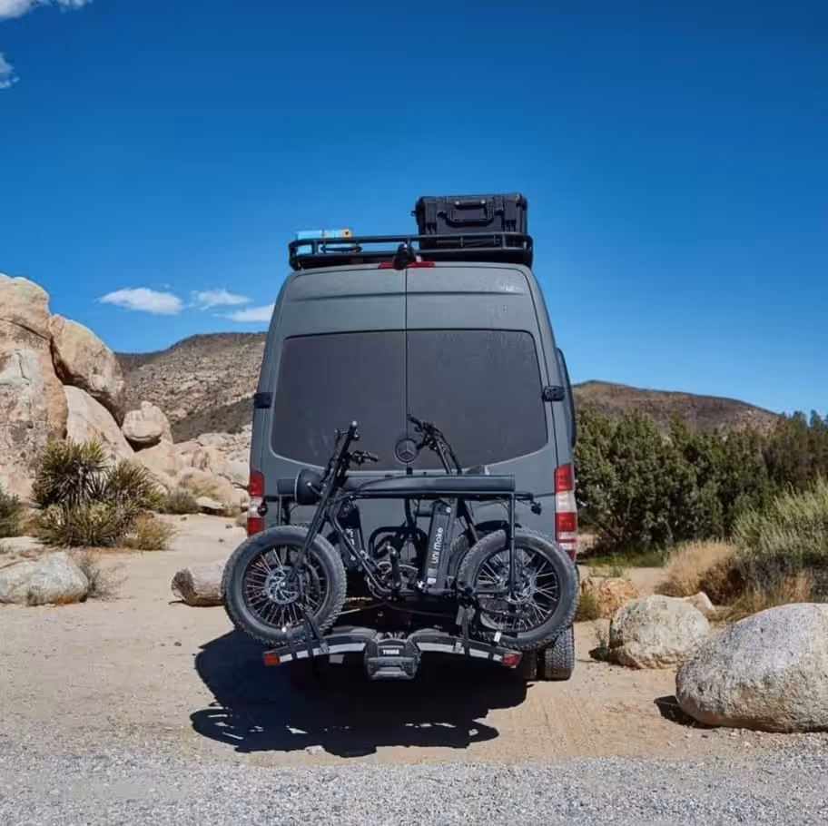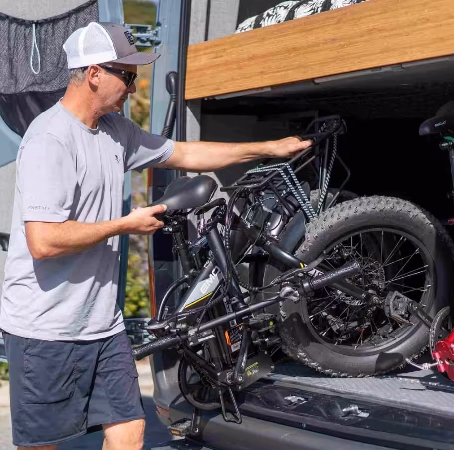 You don’t necessarily have to go for a folding eBike, though, as some RVs allow for you to mount an external bike rack on the rear or the hitch of your vehicle. It’s important to note that it’s not as simple as bolting them on and hoping for the best as it’s not a one-size-fits-all approach. Adding anything of weight to your RV requires both structural and safety considerations. Read some common mistakes in our 5 things to consider when fitting caravan bike racks articles.