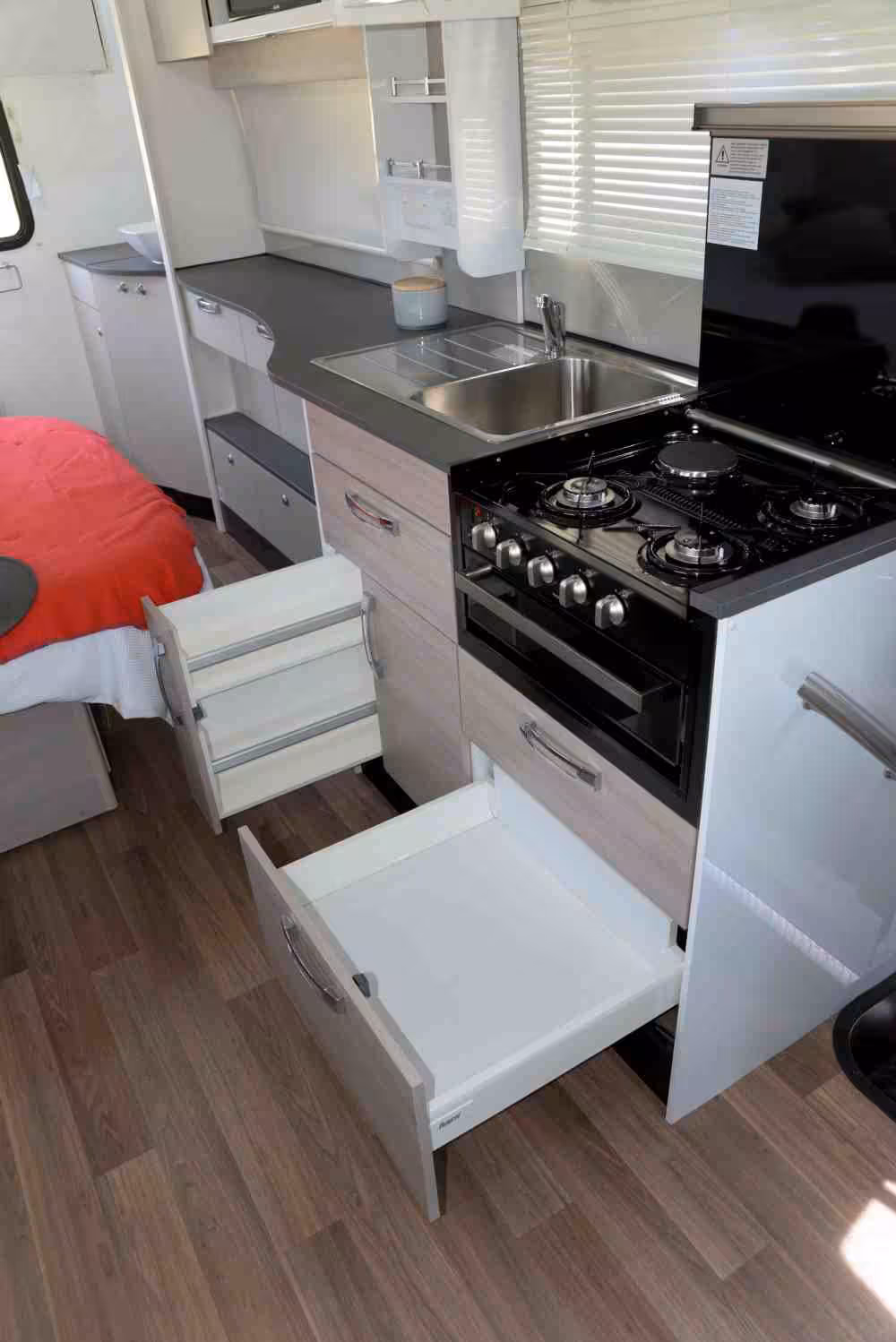 On the passenger side is a Dometic 190-litre, two-door fridge and above that is a Samsung microwave. A drop-down table, which is handy during prep time, comes off the fridge wall and locks in next to the Dometic cooker with grill, which lives beside the sink. The rest of the benchtop continues to the ensuite wall, with a neat little slide-out pantry, ample drawers and overhead cupboards, with the one opposite the bed housing the Axis flat-screen telly.