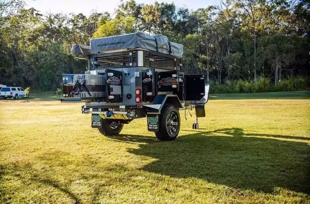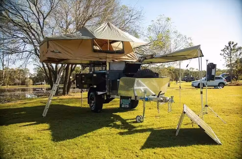 Of interest are rooftop tent campers, which are basically box trailer campers with a rooftop tent mounted up top. Austrack Campers make a capable off-road one which you can see in the images below.
