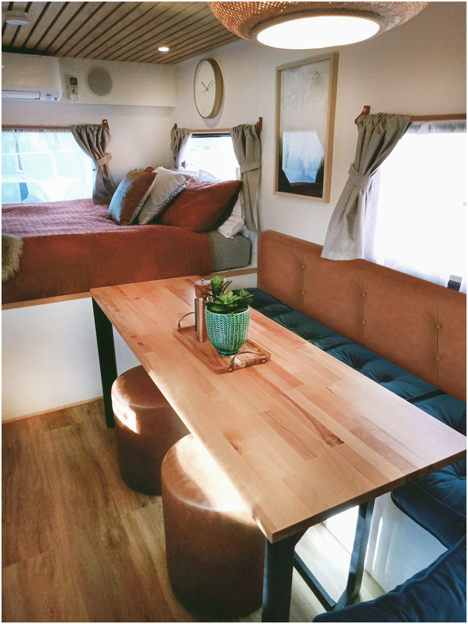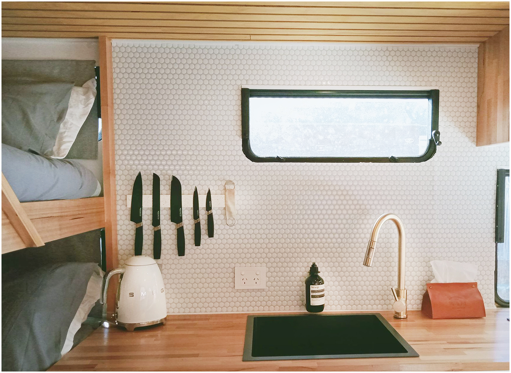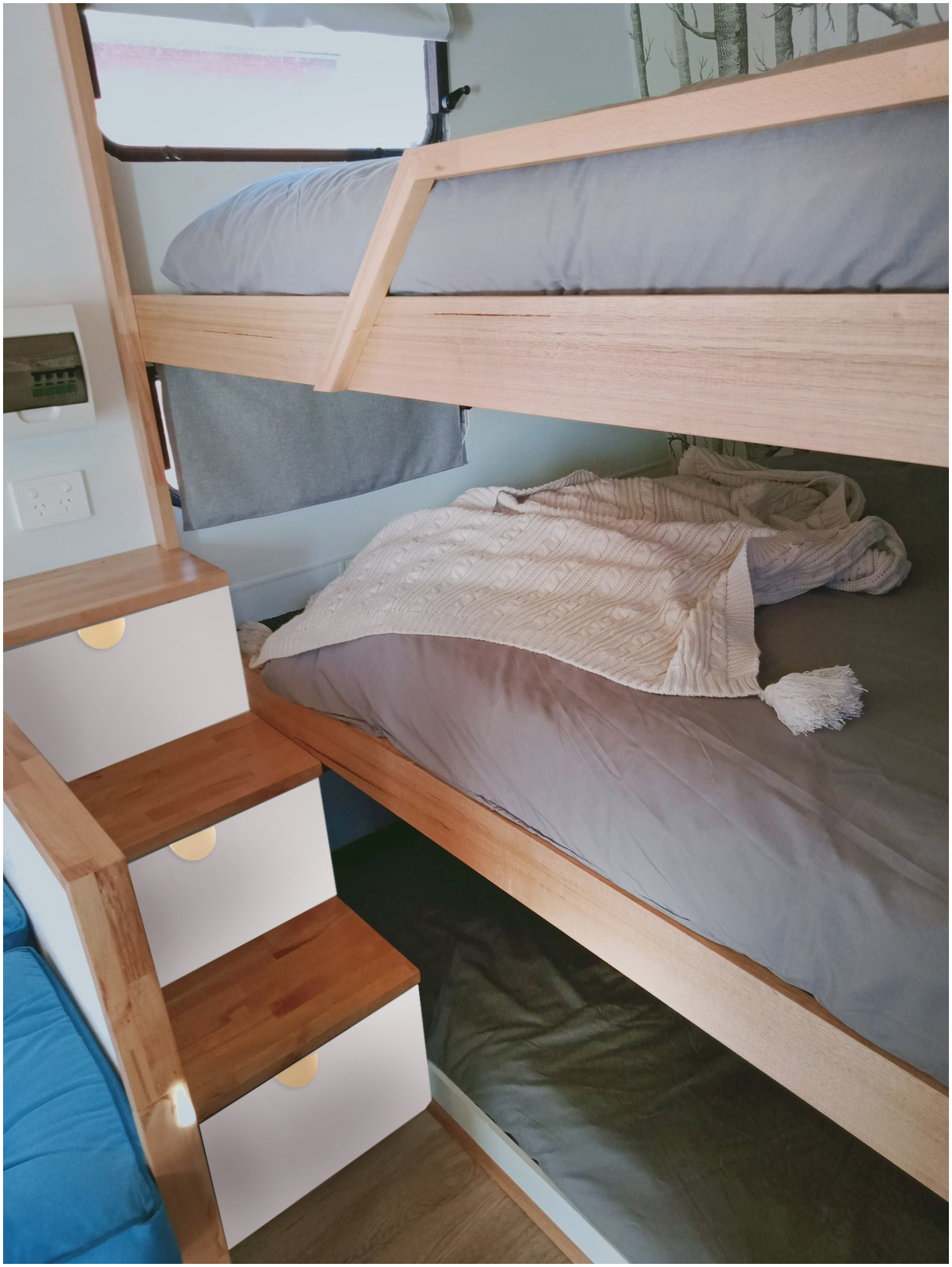 The only assistance we sought was to have the electrics completed and the reverse cycle air conditioner installed professionally by Launceston Electrical. We also had the wallpaper installed professionally on the bunk side. The rest of the build and design was all us and we are really proud of our efforts.