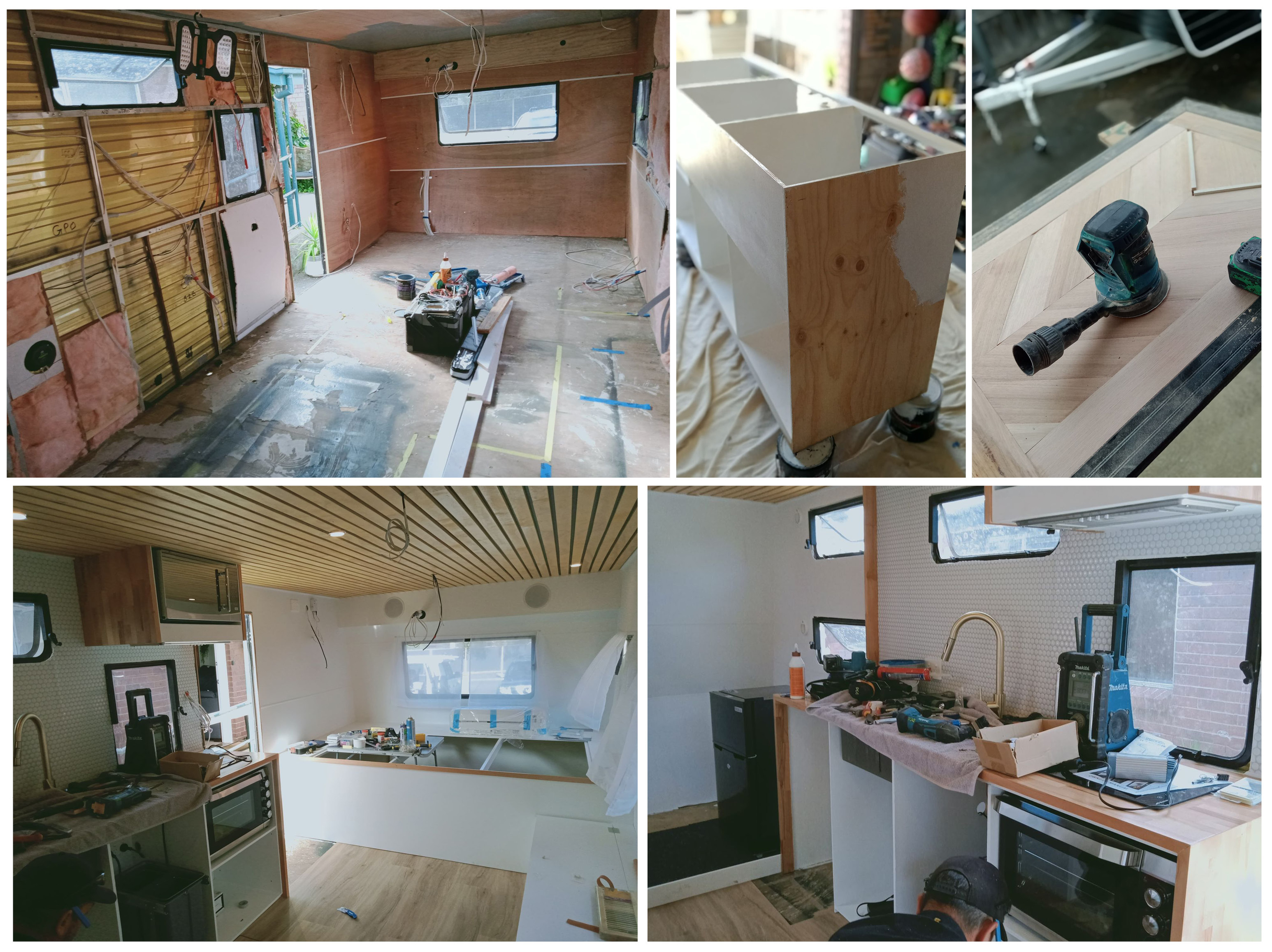 Happy to say not really. We had a vision. Charlize designed it on the computer with ongoing alterations until the family was happy with the layout. It all came to fruition better than we expected. With Tim’s unique solution to such small headroom in the bunks – deciding to make the top bunk floating thus a large gap next to the wall for the below double bunker to move around (and the kids love climbing between those bunks now), the whole project was a roaring success. From the custom-built timber chevron door constructed from an old screen door frame to seeking a lot of Pinterest caravan renovating inspiration, we managed to pull it all off through hard work and determination!