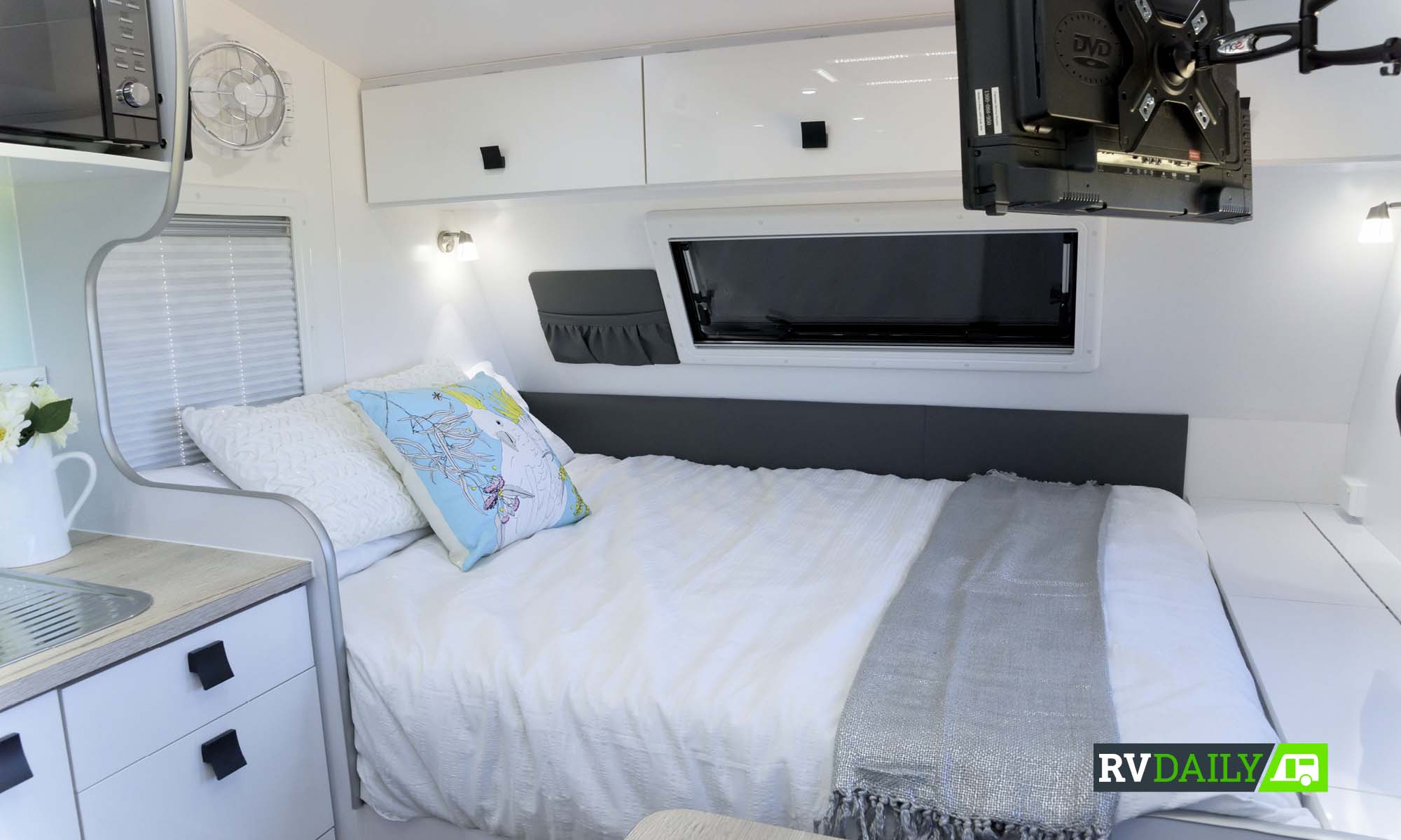 The ensuite is trimmed-out to match the kitchen and is very neat for a small space. A fibreglass shower is standard but Harmony added the Daewoo mini washing machine for practical cleaning while free camping. The Thetford swivel toilet is also standard but I liked the built-in clothes drawer and the storage shelves. This is a great, practical space.