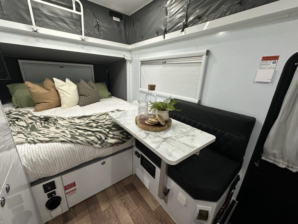Inside, you’ll find a diesel heater for cold nights and air conditioning for those scorching outback days. The plush king-size bed and lounge setup provide genuine comfort after a day on the tracks. Nevertheless, remember this is an 11-foot hybrid – space is maximised, but it’s still compact living.