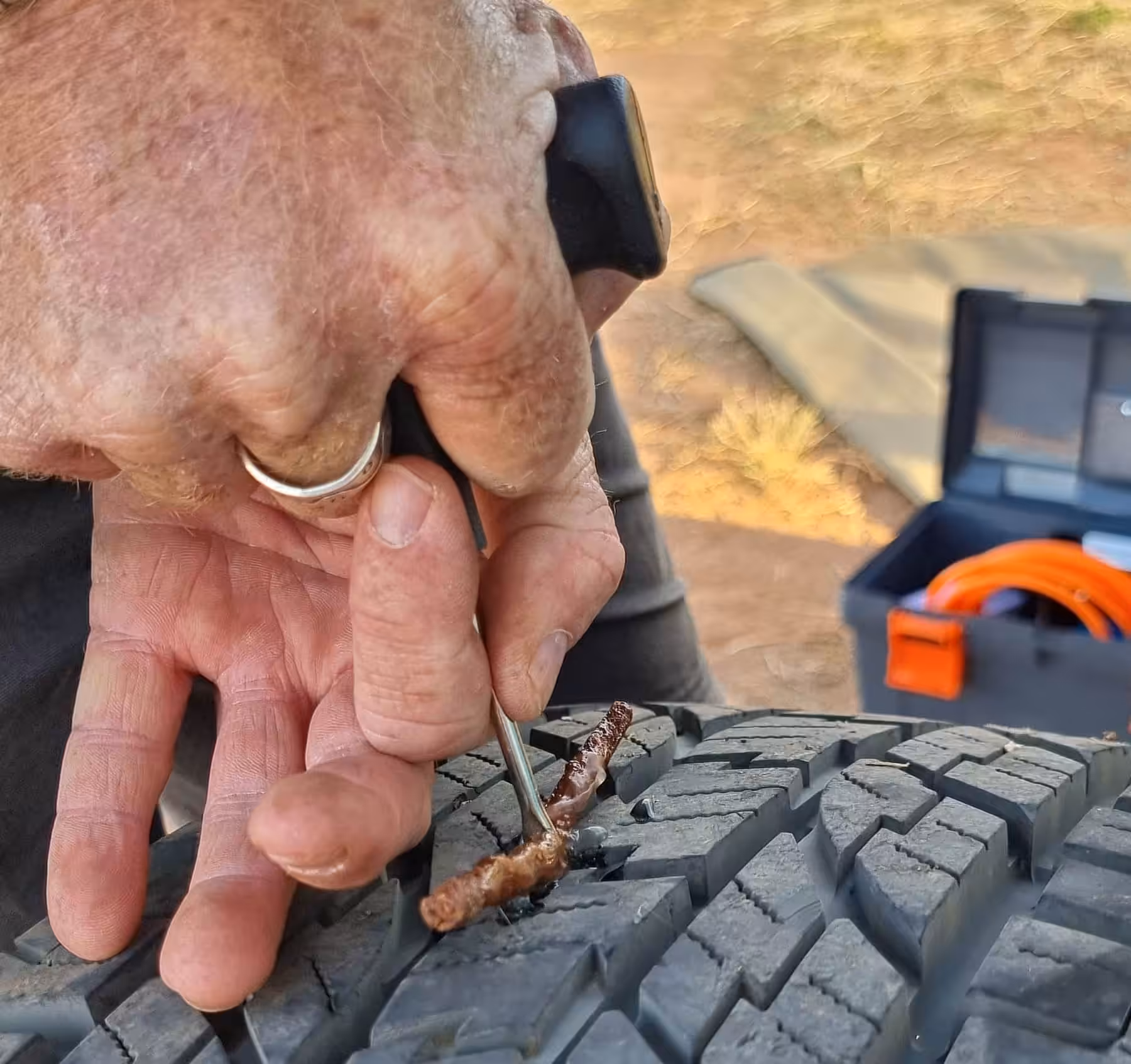Yes, I could have swapped one of my two spares onto the van and paid to have the flat fixed in the next town we went through. But, given that I always carry a tyre plug repair kit and compressor, and we were not due into a town for well over a week, the tools came out at camp.