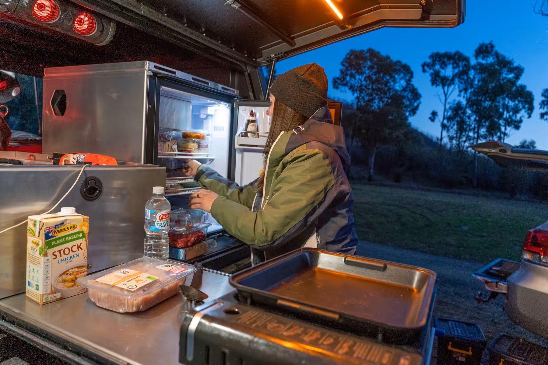 There’s a few different options on the market but we always tend to come back to quality units like the Twin Drawer Module from 4WD Interiors over the cheapy offerings. They tend to have clever design features like drawers that lock in the out position so you’re not fighting them just to get a tin of beans, safety grip handles so little ones don’t get their mittens pinched closing them, and lots of organised storage with dividers and side access. They’ll flat out just last longer too, and that’s smart money.