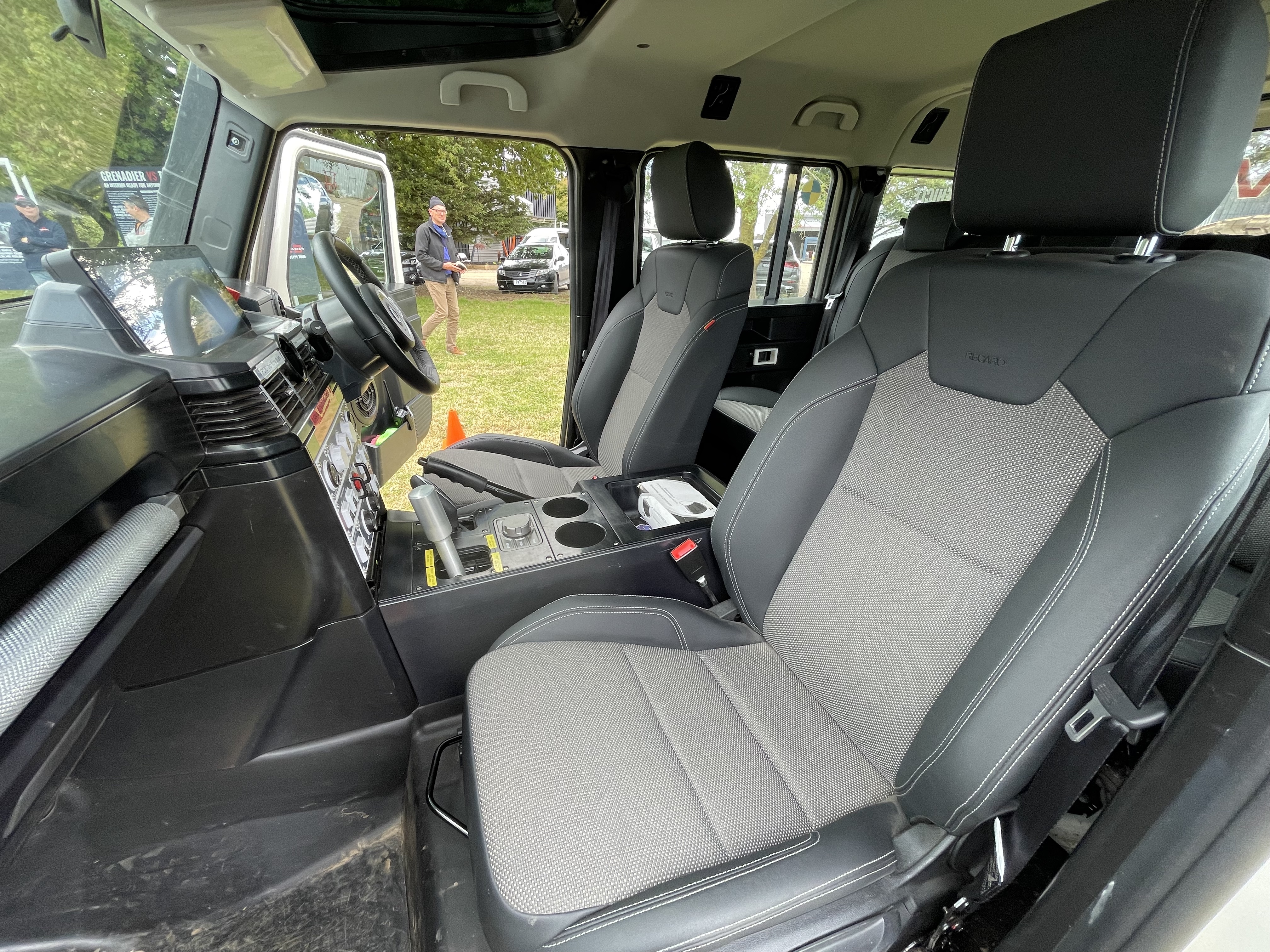 The interior was the real surprise for me. Let’s face it, the old Land Rover Defender was a pretty uncomfortable beast. You almost had to hang half your body out the window to fit into the front seats. Given the Grenadier looks so similar to the old Defender, I was expecting much the same. Not so. The Recaro seats are exceptionally comfortable and there is plenty of shoulder room for even the widest driver. The interior door trim is quite thick giving you plenty of room to rest your arm if needed. There also appeared to be loads of legroom for taller drivers however we did note a part of the transmission tunnel intruded into the left of the driver’s footwell making it a bit uncomfortable. Ineos told us this had been highlighted in previous testing and will be addressed in the final production model.