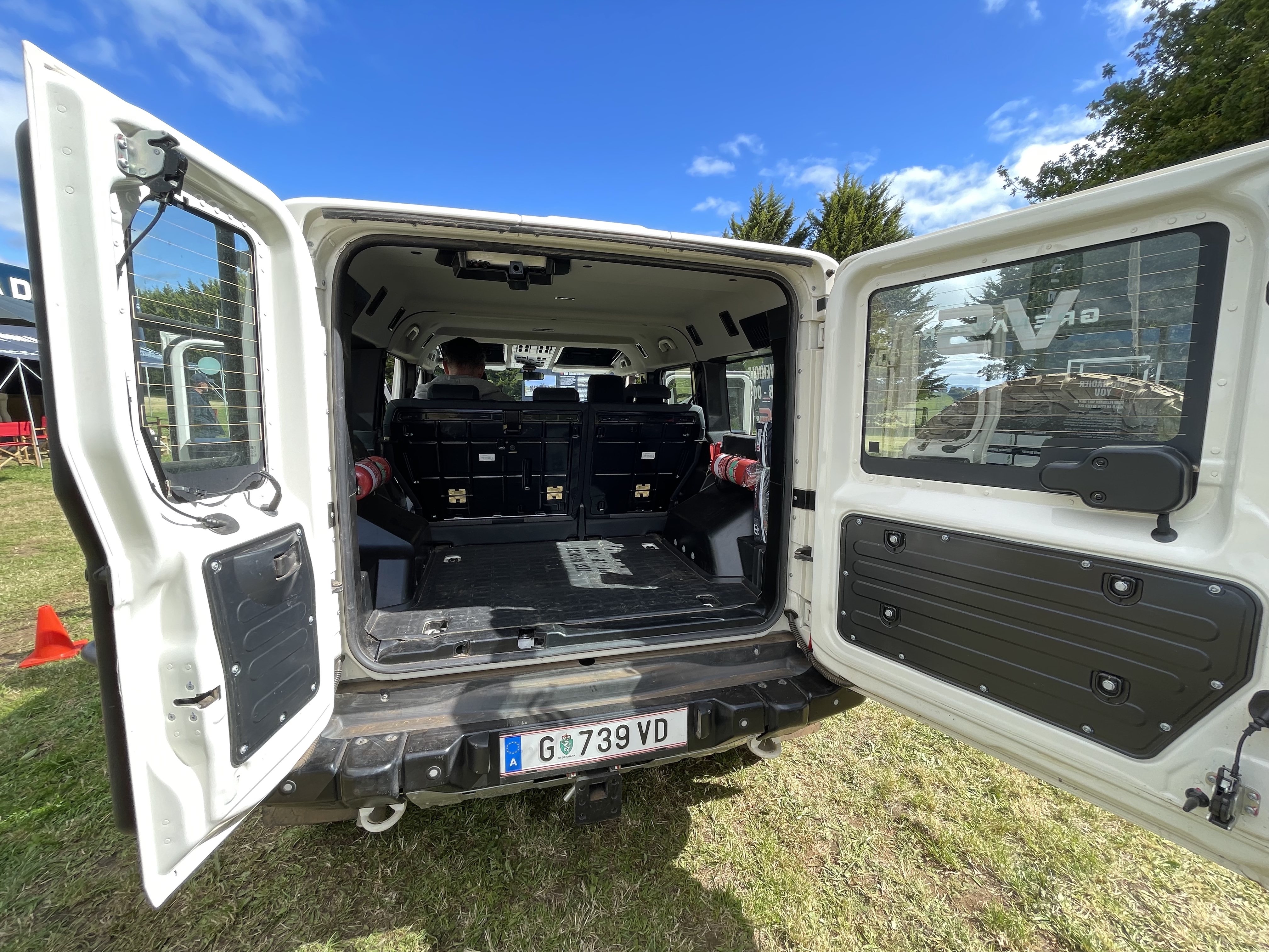 Checking out the rear cargo area was a real surprise. The split barn doors open wider than the body of the vehicle making for easy, unimpeded access to the huge rear space. Ineos reckon you can fit a whole European-standard pallet in there which is quite impressive. The prototype has four tie-down hooks in the floor but the production model will be fitted with a more flexible adjustable system.