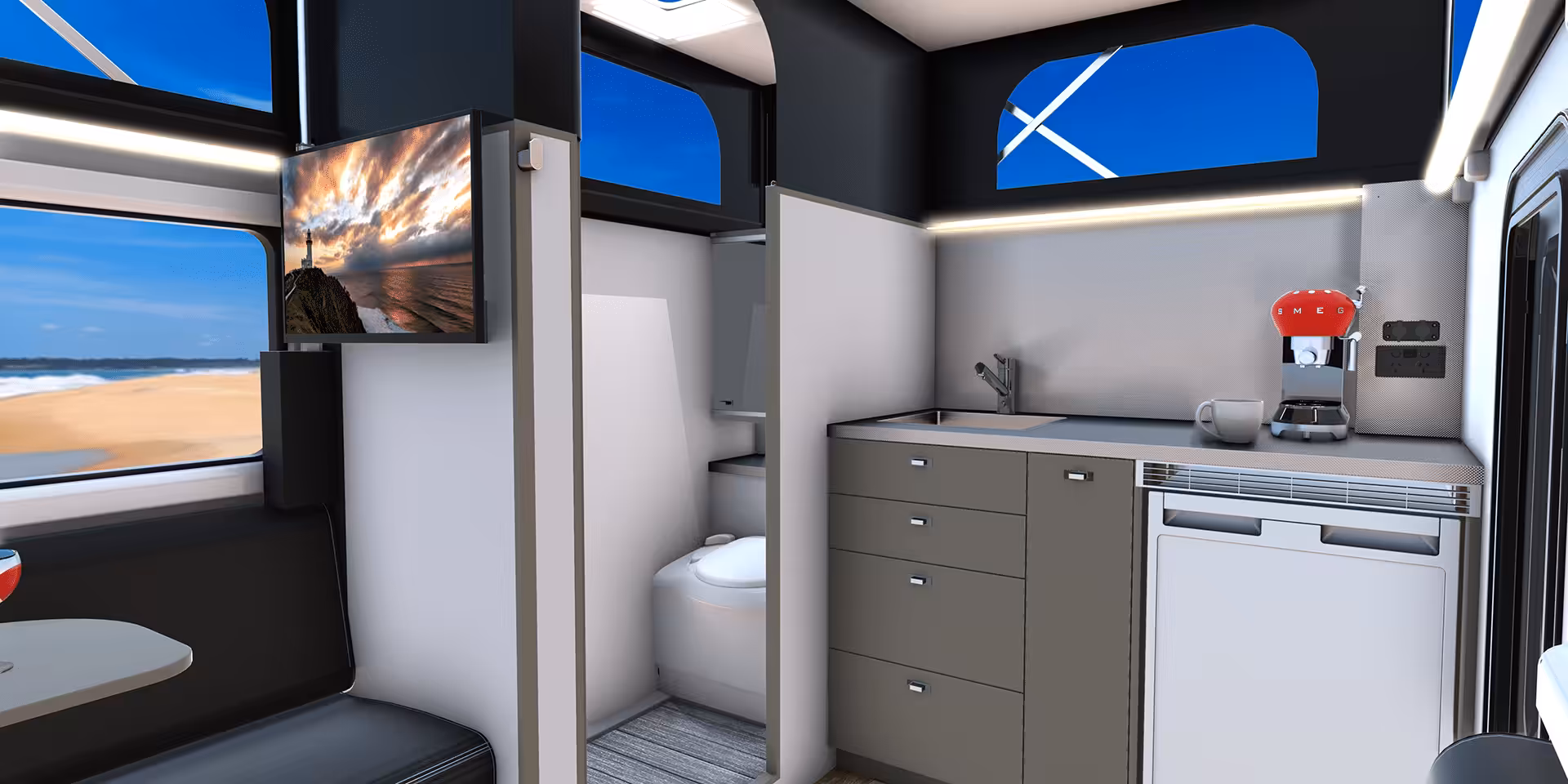 Embracing al fresco culinary pursuits, the H16’s hybrid configuration seamlessly integrates a premium outdoor kitchen, akin to its Cub counterparts, with a sprawling Fiamma awning that extends the outdoor living. Boasting a SMEV 3-burner stainless steel stove, sink, and the iconic textured stainless steel work surfaces, this kitchen is both suave and robust.