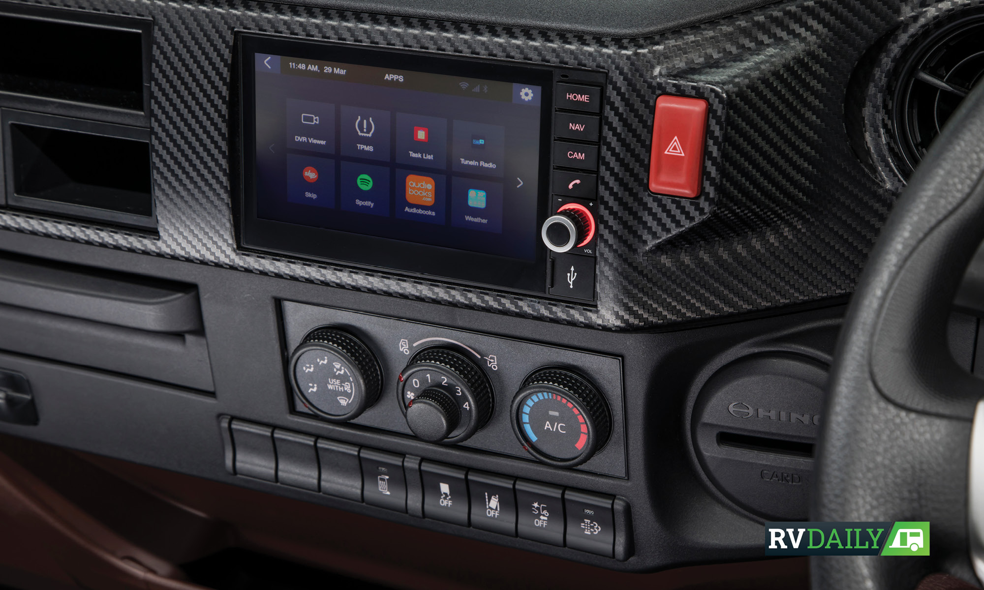 All new Hinos will now get a new multimedia unit that incorporates a reversing camera, Hino app store, optional satnav, Bluetooth, dashcam, tyre pressure monitoring, lane change assist four-way camera system, fuel usage monitoring and vehicle and driver information. The satnav is smart enough to account for the truck’s width and size in route restrictions, and has over-the-air updates. While not of interest to recreational users, there’s also fleet monitoring features. This is welcome news as increasing numbers of owners outgrow utes and look towards trucks in the 4.5 to 6-tonne class as tourers, but don’t wish to go back to the ’90s for in-vehicle comfort.