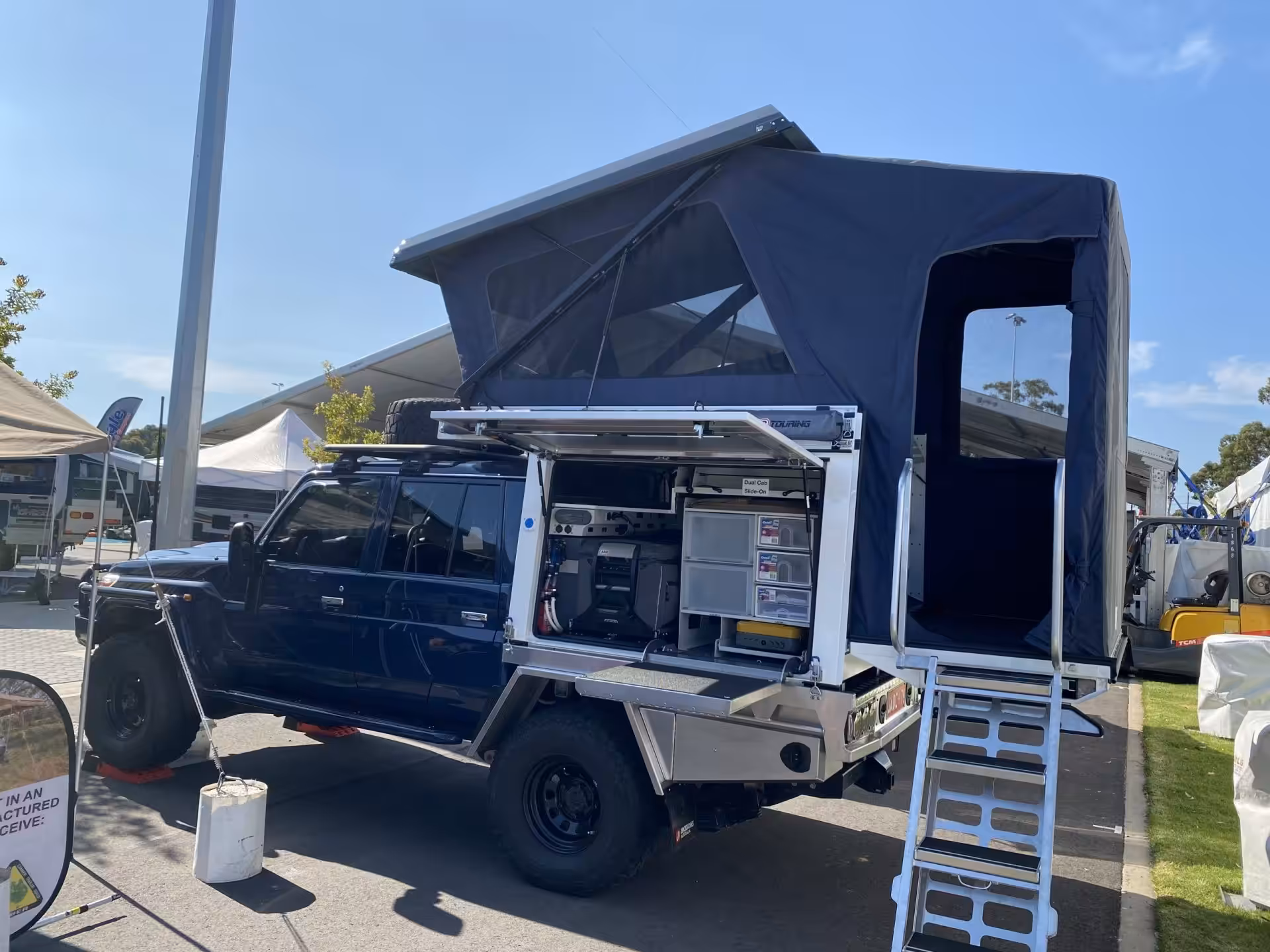 Features in the kitchen area include lightweight plastic style reinforced pantry drawers, an area for condiments and a gas cooker on its own slide-out. The opposite side of the canopy can be customised and has been left open to accommodate larger items.