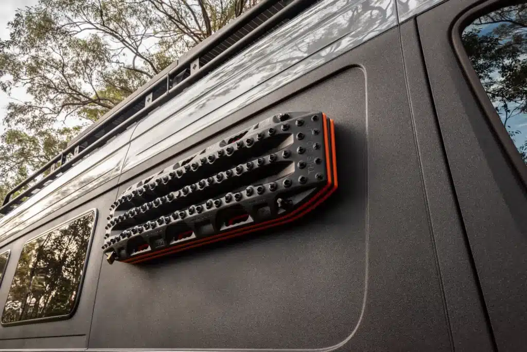 The kit list reads like a serious tourer’s wishlist: upgraded suspension designed for corrugations and rough tracks, a snorkel for water crossings, comprehensive underbody protection, roof-mounted ladder for accessing the Aeropod storage pod, driving lights for night travel, UHF communications, and Maxtrax recovery boards. There’s a rear-mounted spare wheel that’s actually accessible, plus dual hot and cold outdoor showers. The 4.5-metre electric awning extends your living space significantly, and if you’re keen, you can add walls and flooring to create a proper annex room underneath.