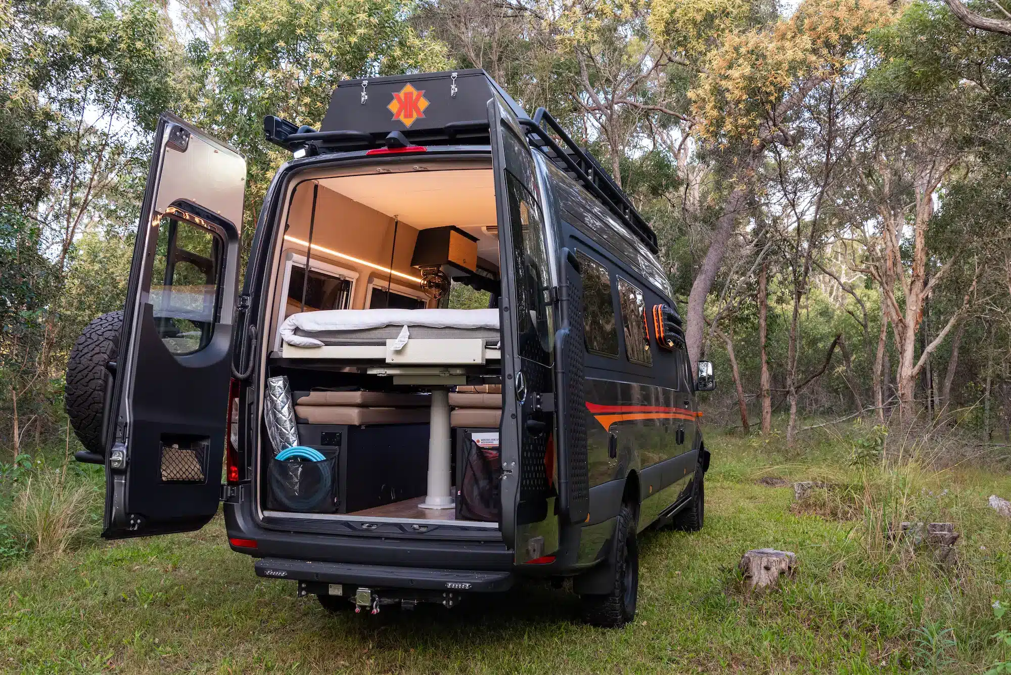 Climate control extends throughout the cabin with thermal blinds, insect screens, and tinted caravan-style windows. The rooftop reverse cycle air conditioner maintains comfortable temperatures whether you’re parked in Broome’s heat or the Snowy Mountains’ cold. The well-insulated cabin helps the system work efficiently without draining your battery bank.