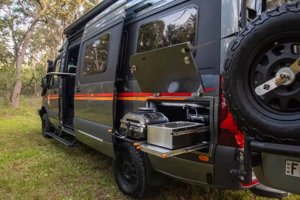 The outdoor kitchen slides out when you need it, offering a prep bench, another sink with hot and cold taps, and a Ninja portable electric BBQ. After a long day on dusty tracks, being able to cook outside without fussing with gas connections or worrying about wind blowing out flames is genuinely convenient. Plus, you eliminate the weight, compliance issues, and refilling hassles that come with LPG bottles.