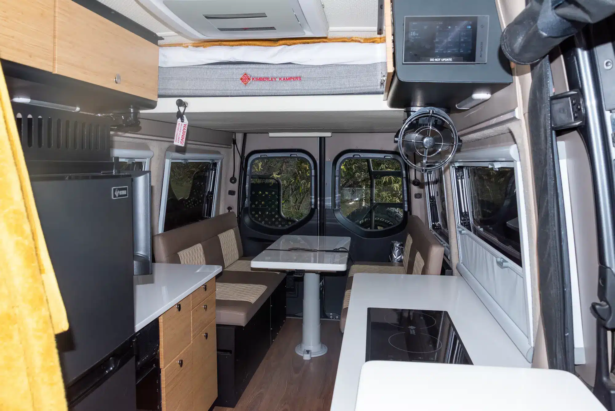 Walk inside and you immediately notice the construction quality. Kimberley has avoided timber entirely, instead using composite panels for floors, walls, and ceiling. The cabinetry is lightweight aluminium, and they’ve incorporated recycled PET plastics throughout the build. This isn’t greenwashing – these material choices serve practical purposes beyond environmental credentials.