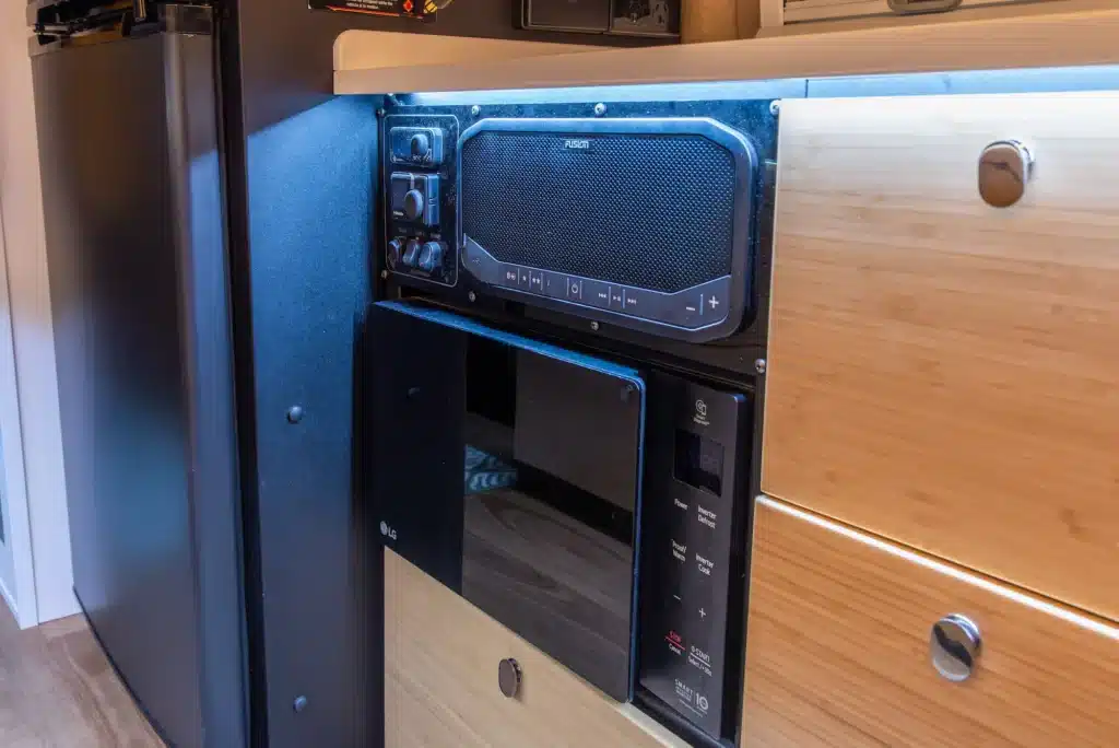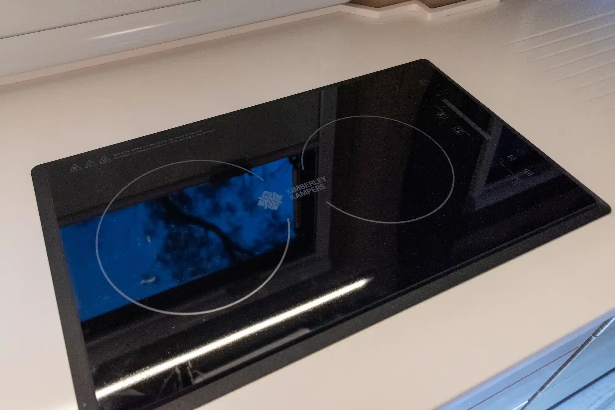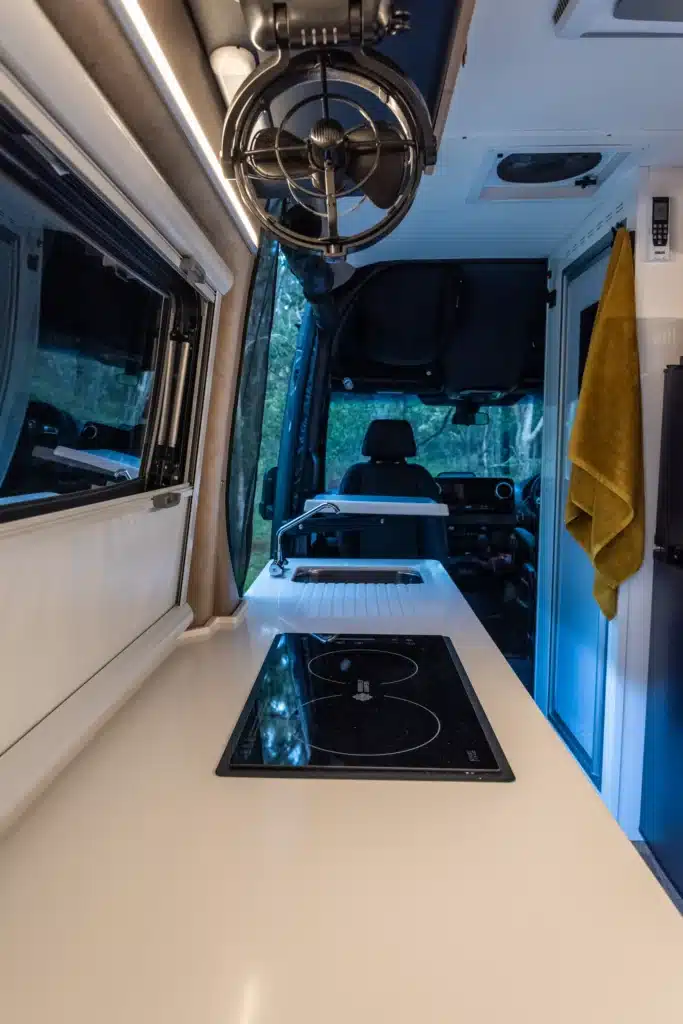 Here’s something that surprised me: there’s zero gas on board. The entire cooking setup runs on electricity, which initially seemed risky until I understood the power system’s capacity. Inside, you’ve got a dual induction cooktop built into solid-surface benchtops, paired with hot and cold water at the sink, a microwave, and even wireless device charging integrated into the workspace.