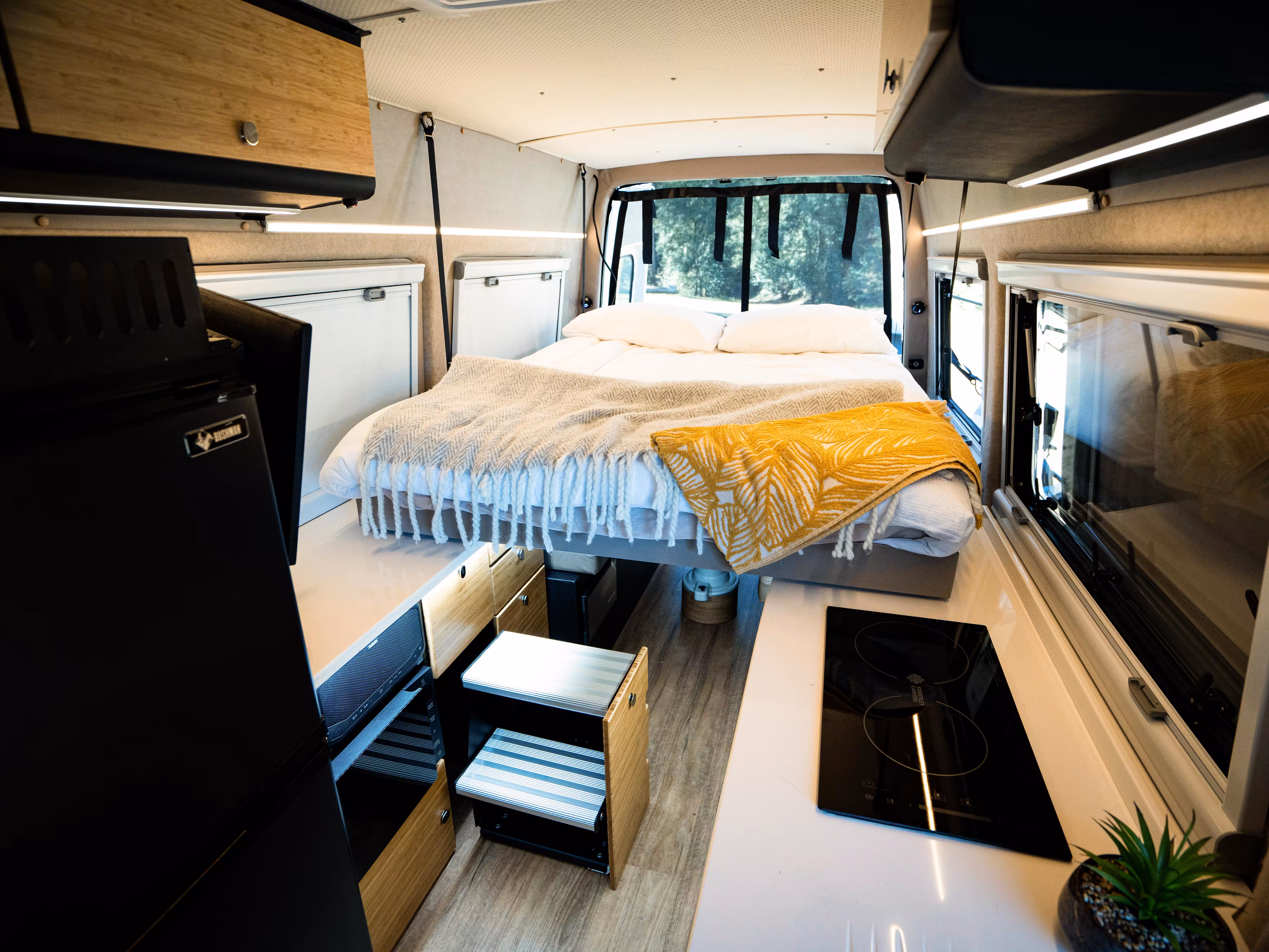 Introducing the Kube, KK’s take on a teardrop camper trailer with 360-degree windows, and the Kruiswagen, a luxury off-road motorhome. Nothing new here, you say. Teardrops and motorhomes have been kicking up the dust for decades. It’s true. But show me another RV that uses super-thin (2mm) lightweight solar panels developed in Silicon Valley – the kind that can be found blipping around the Earth on NASA satellites. Add to that a 48V solar system and composite panels made from 100 per cent recycled plastic bottles, and the Kimberley Kamper builds are something of a unicorn.