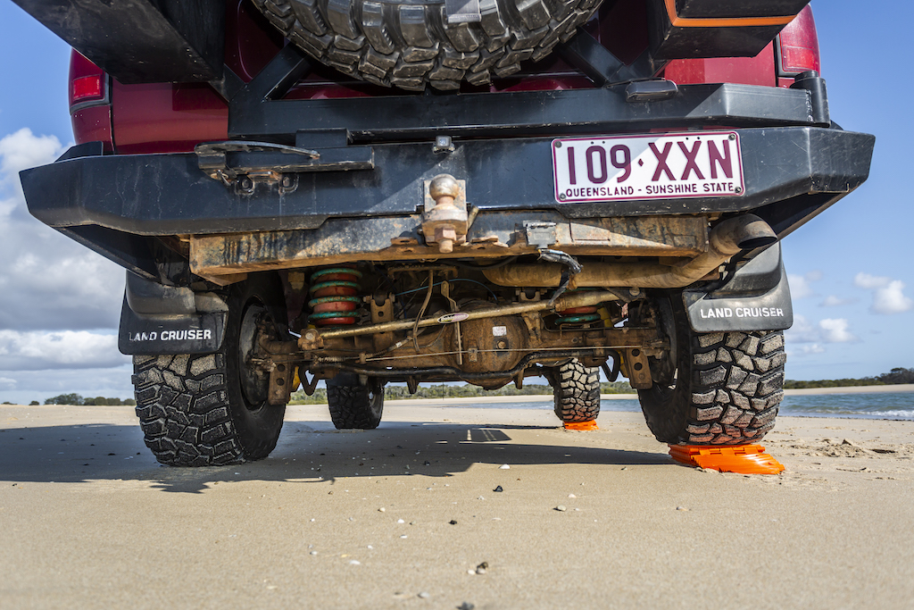 We got our hands on a set and had a play with them in the sand of Palm Beach in Queensland, putting them through their paces for both uses they are advertised for. They held up well to 3.1-tonnes of LandCruiser dragging itself up out of a sand hole, and the ramp and boards performed well as a leveller for the ‘Cruiser.