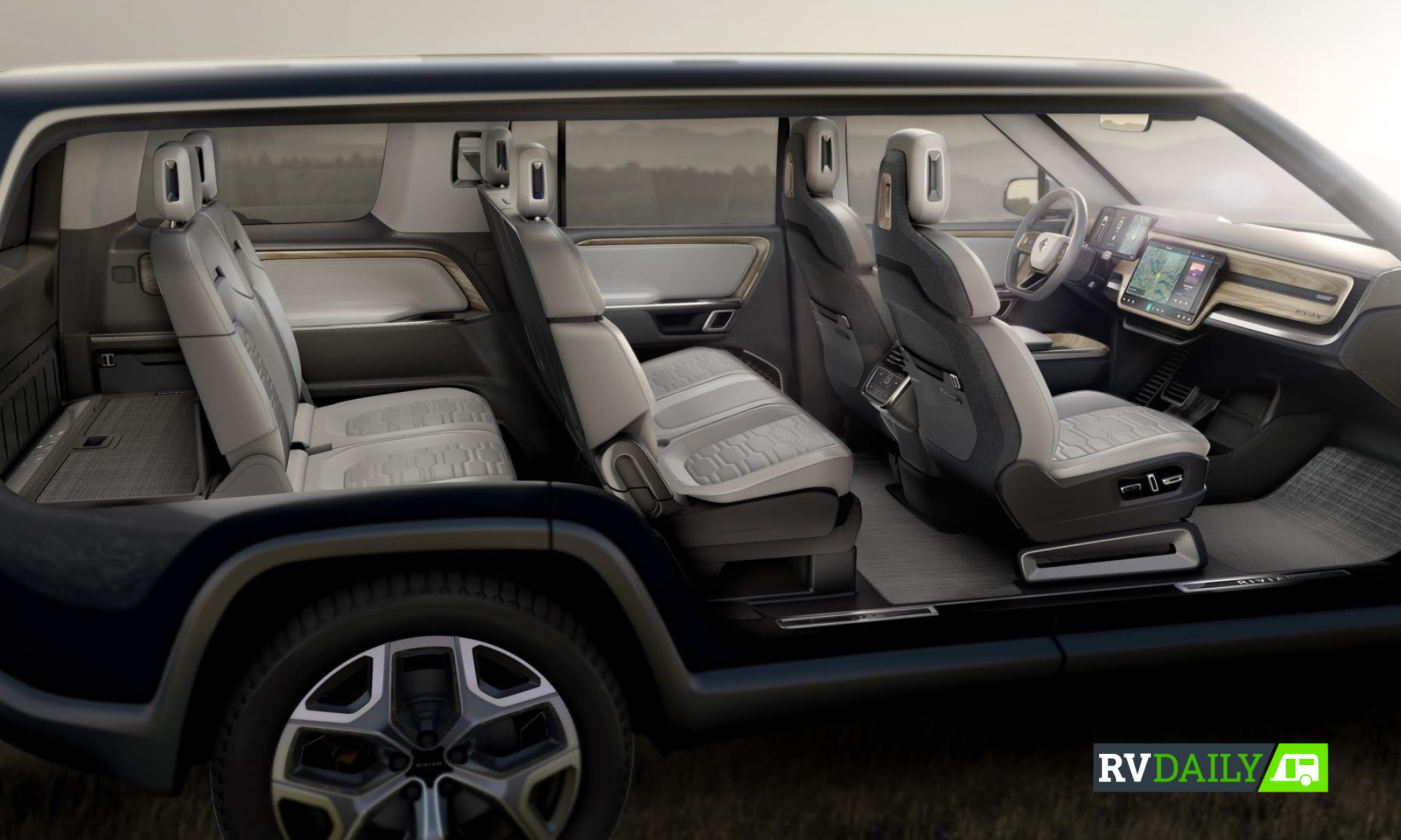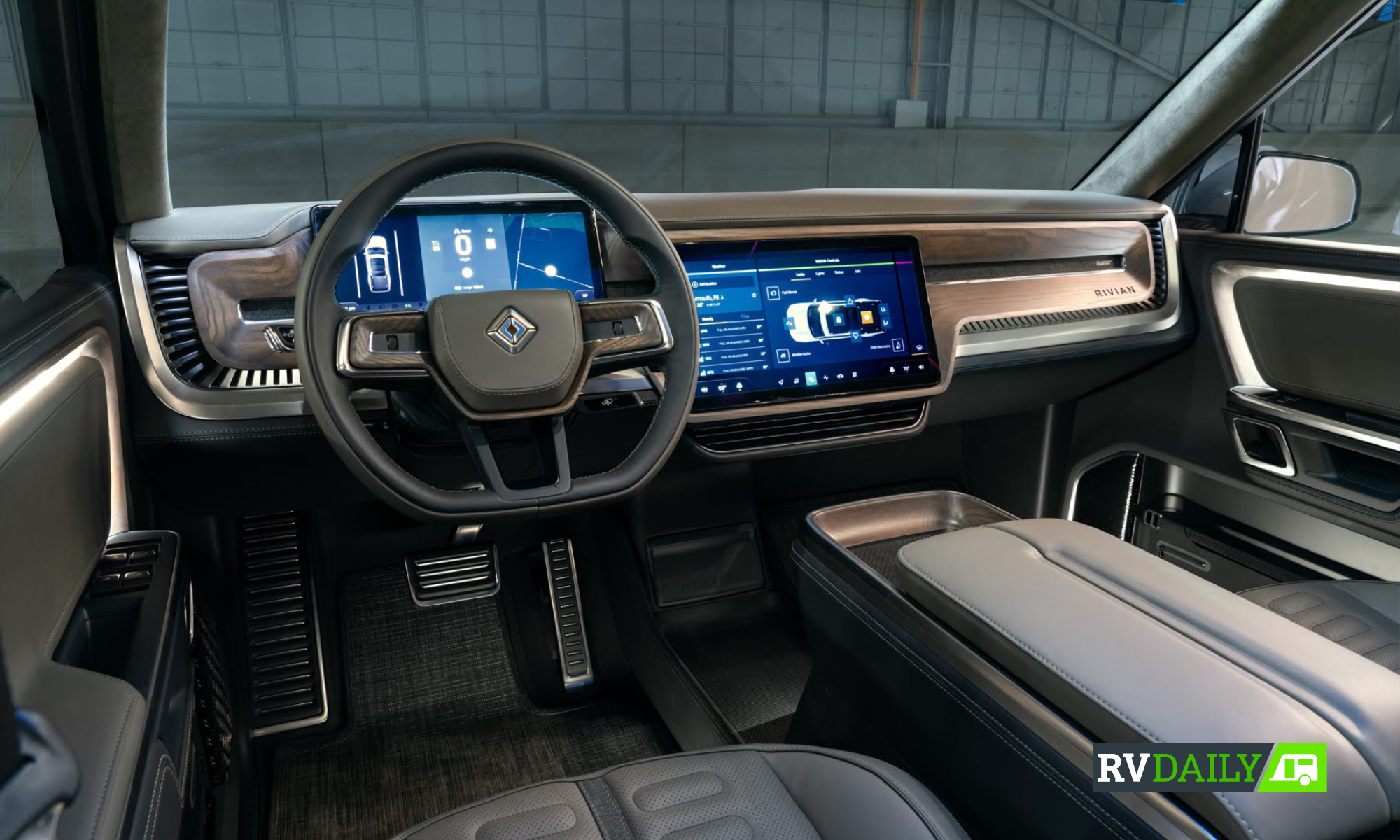 That would be individual wheel drive. There’s four motors, one for each wheel, driving in unison. Without going into a dissertation on vehicle dynamics, that offers immense capability. Forget locking differentials, LSDs and electronic traction control; each wheel will meter out precisely the torque it, and it alone needs. That means capability such as precisely neutral on-road handling, no wheelspin off-road and skid-style steering. Then if we add in the array of sensors – radar, lidar (like radar but with light not radio), ultrasonic…could well be that the Rivian vehicles continually and pre-emptively configure themselves to adapt to the terrain technology Land Rover has been developing for a while.
