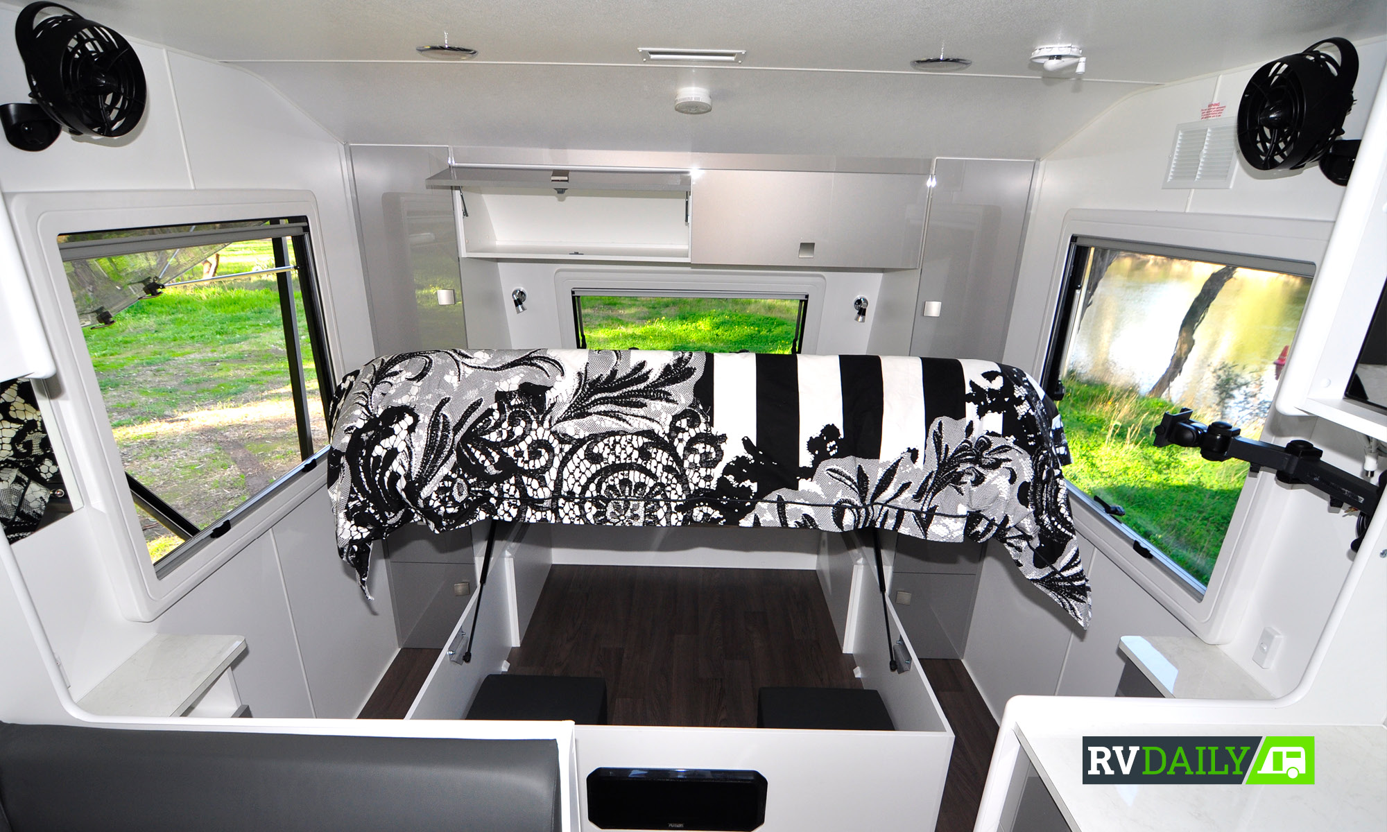 Overhead is the Ibis MK3 reverse-cycle air conditioner to keep you comfortable in all seasons, aided by fully insulated walls and roof. There’s also a Winegard HV TV Antenna plus a 150-watt solar panel with digital regulator and dust pressure hatch. The side panels have the usual collection of hatches, vents, inlets, 240V and 12V electrical connections and lockable fillers, plus a handy fold-down external table and rear storage container.