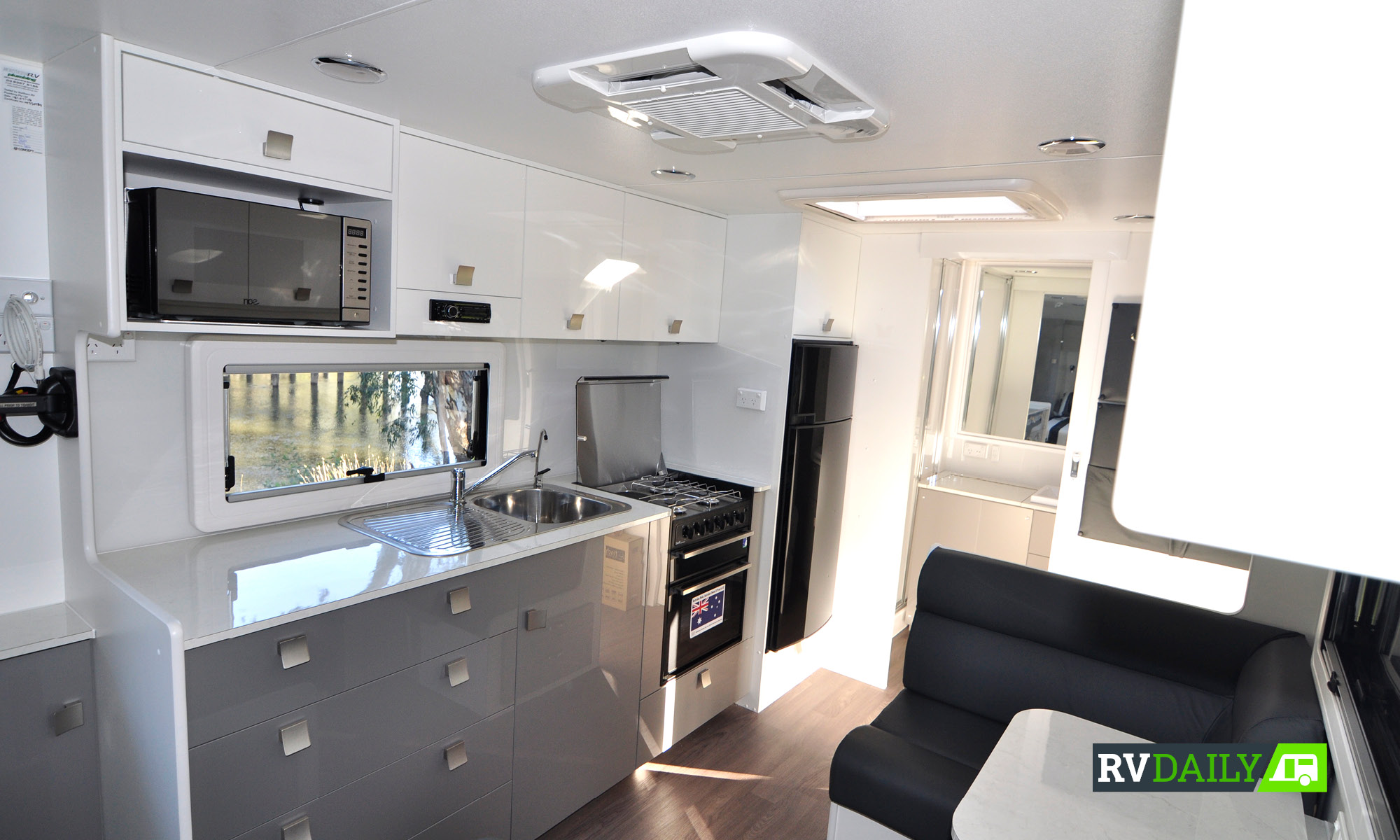The décor follows modern “clean look” trends with gloss white walls and ceiling with matching marble laminate benchtops, offset by grey cabinetry features, stainless and chrome fittings, and grey leather upholstery with plush padding. The high-wear timber grain vinyl floor blends perfectly with the easy clean surfaces, and the overhead 6’6” clearance is spacious enough for most of the RV community.