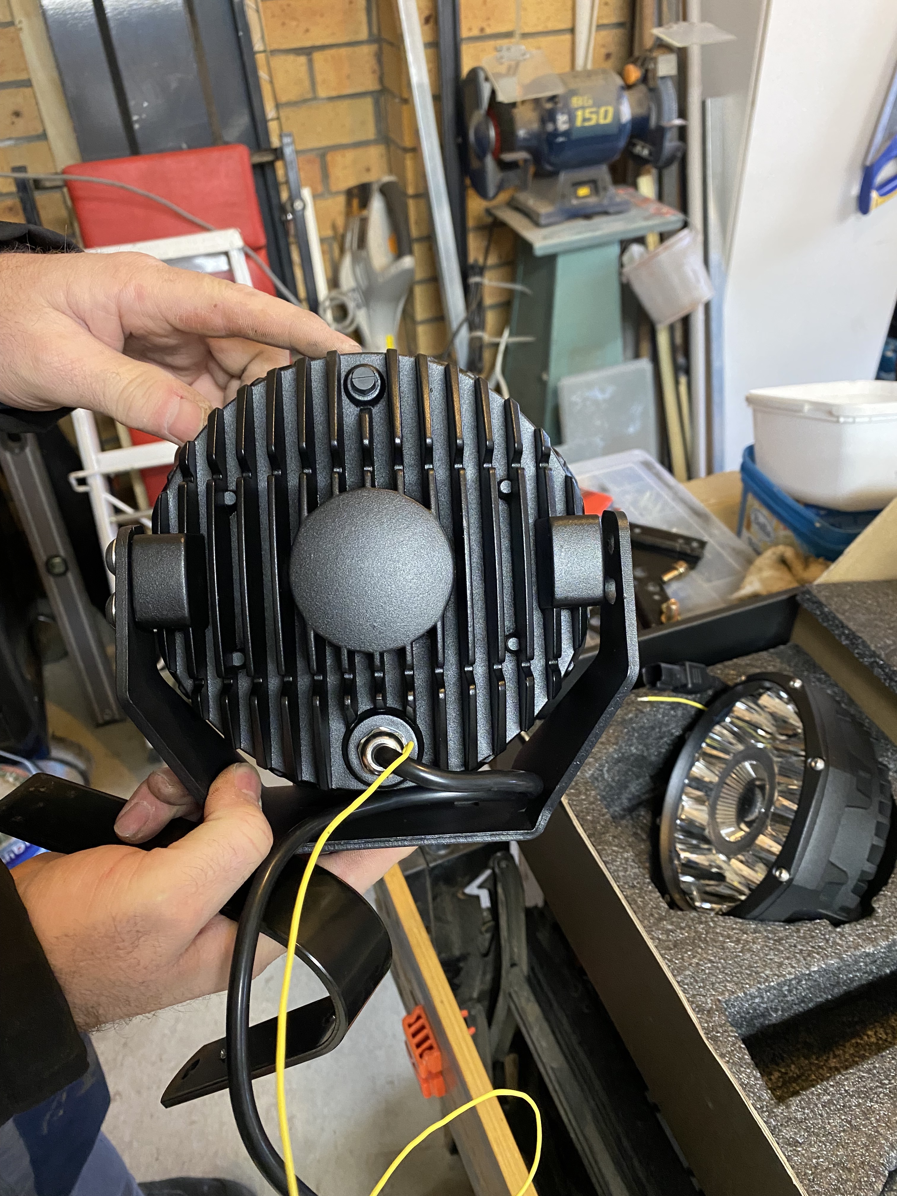 The yellow wire is the pickup for the DRLs. You should put some conduit around it for protection. Dual bolts on each side secure the light in place. These lights should survive the harsh outback conditions.