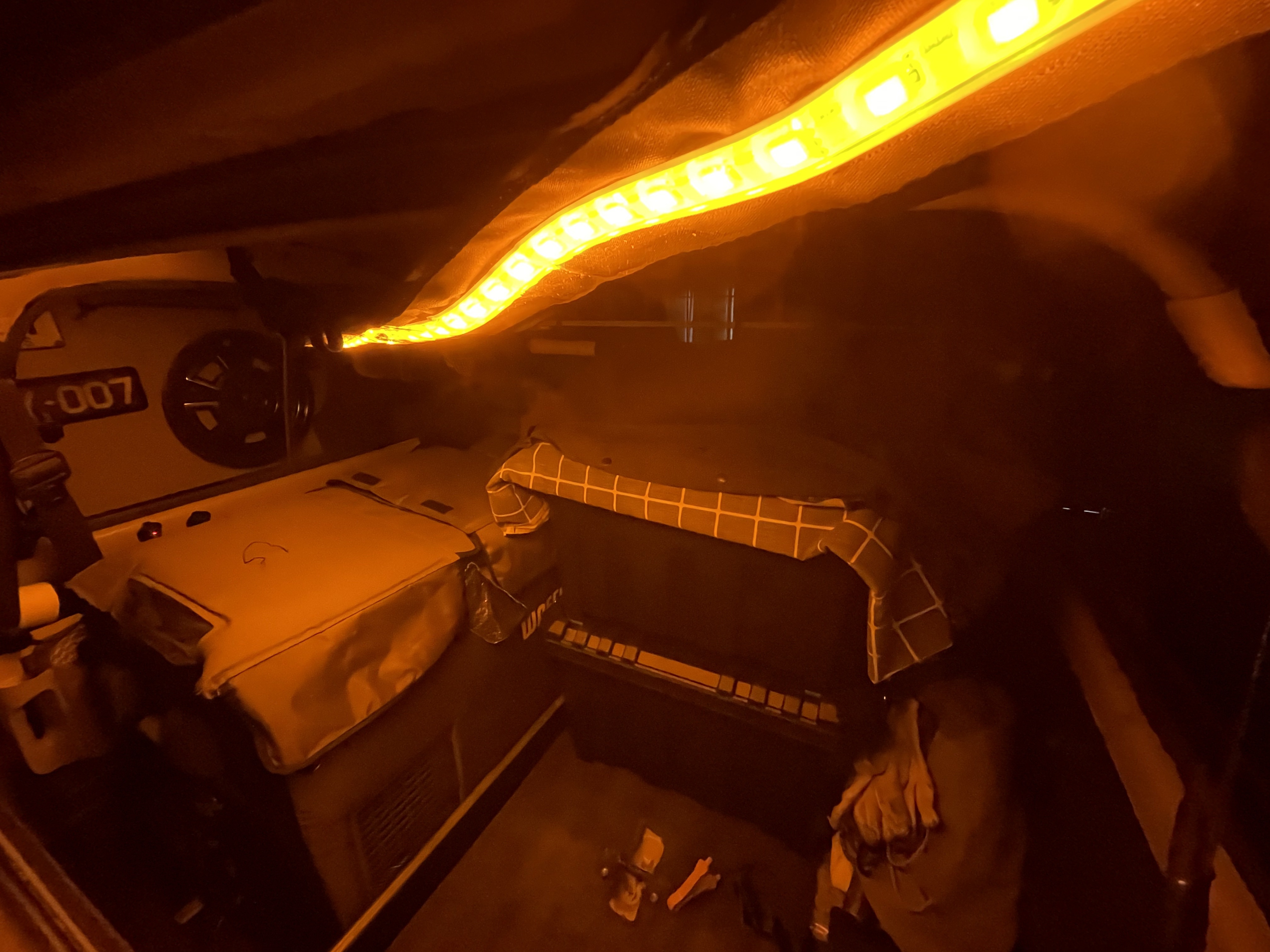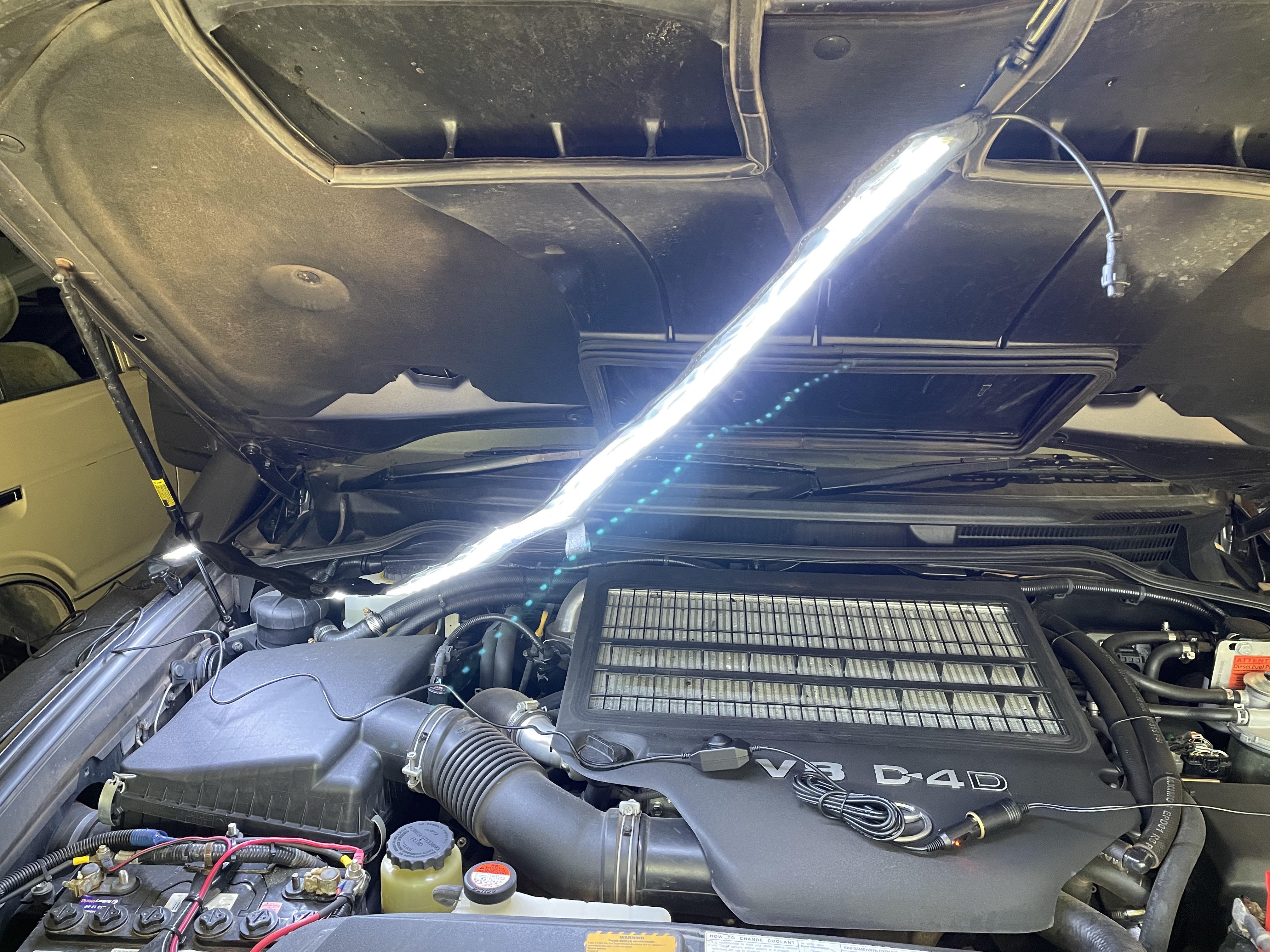 The amber LED lights will keep the bugs away. There’s enough light to work under the engine bay at night. Everything you need is included in the kit.