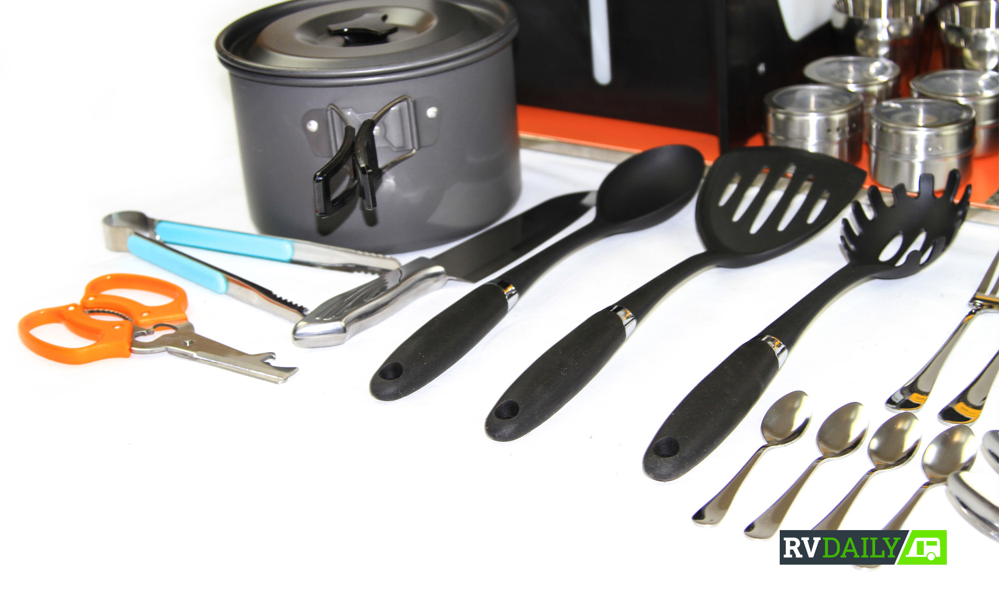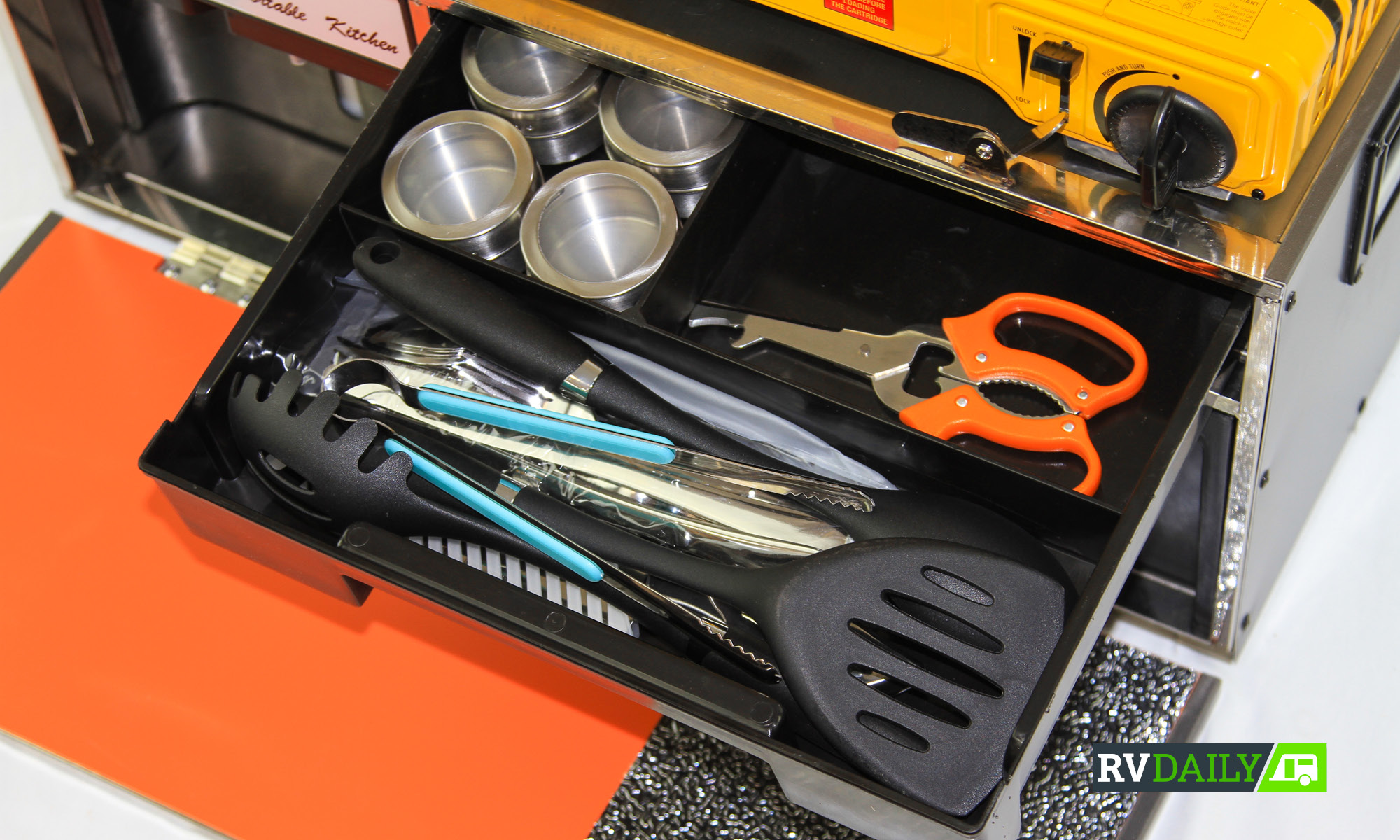 Slide-out shelf houses all utensils, four condiment jars and an evil-looking pair of scissors