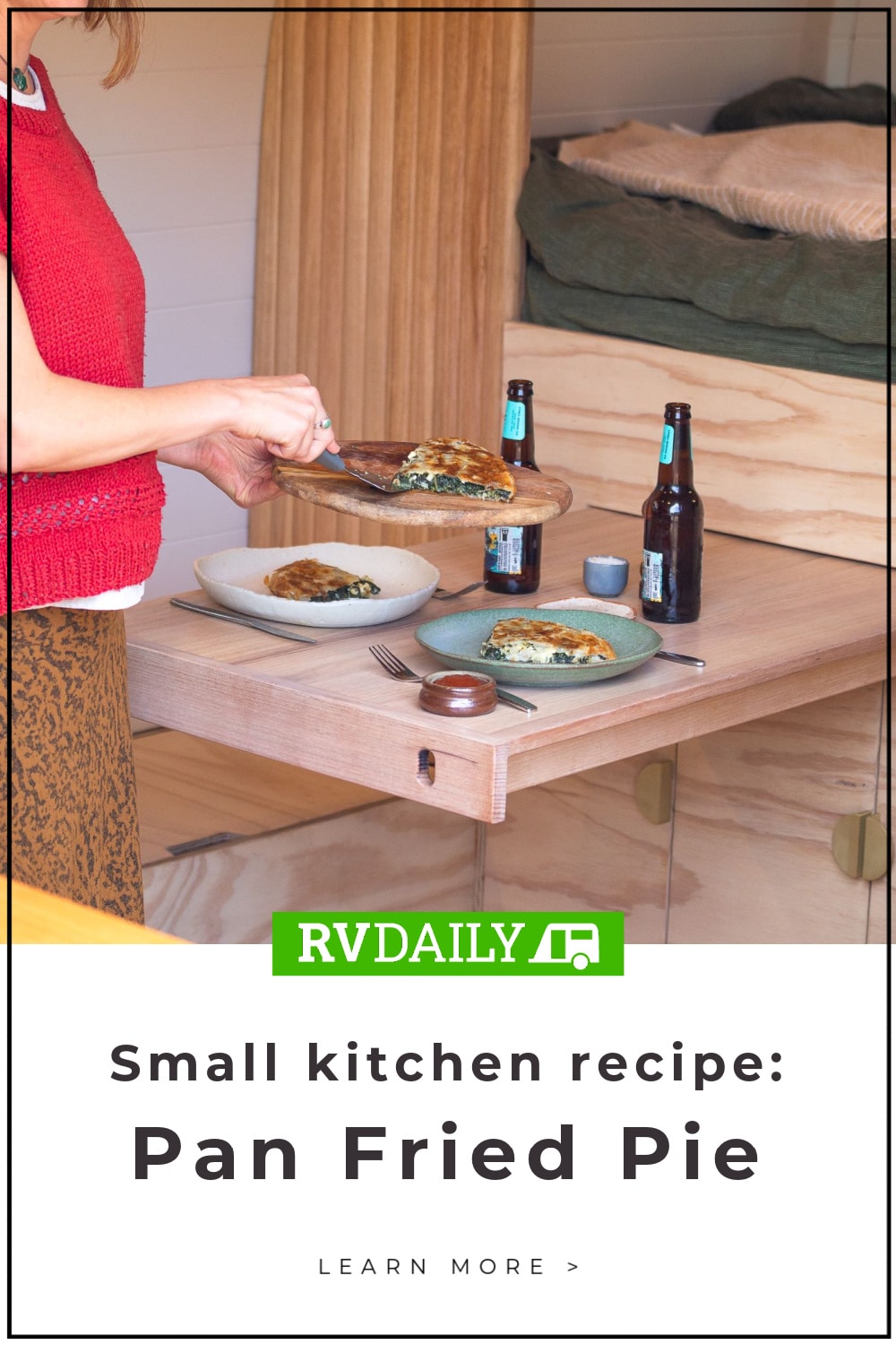 Fear not, pie-lovers who don’t have an oven – there is a way to make delicious pastry-filled treats on the stovetop in your tiny kitchen. It requires one bowl to combine the ingredients and one medium-sized frypan. A good pie is my love’s favourite thing to eat, but, living for many years without an oven, we often missed this amazingly buttery meal. Local bakeries filled the void until we realized that all we needed was a couple of sheets of pastry and a heavy-based frypan. It works a treat, and it’s herby, cheesy and downright delicious.