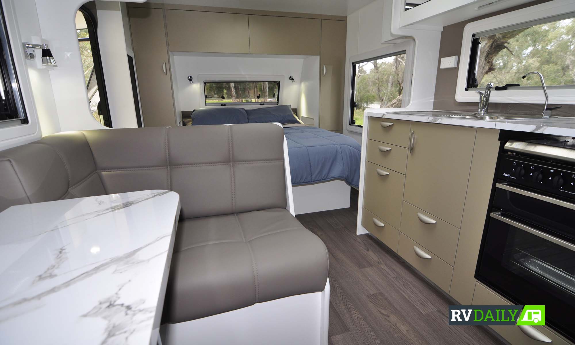 The product is an enticing blend of modern finishes and stylish colour schemes combined with premium creature comforts to please the most fastidious buyer. It satisfies all the senses with comfortable microfibre leather dinette, white marble laminate benchtops, deep redwood flooring and premium mushroom/fawn acrylic finish to doors and drawers. Roadstar is emphatic that all of the superb cabinetry is made from 100% plywood with no MDF and no chipboard. The package is simply RV eye candy with gloss white internal mouldings on the walls and roof, plus the high-end brushed chrome fittings as offsets.