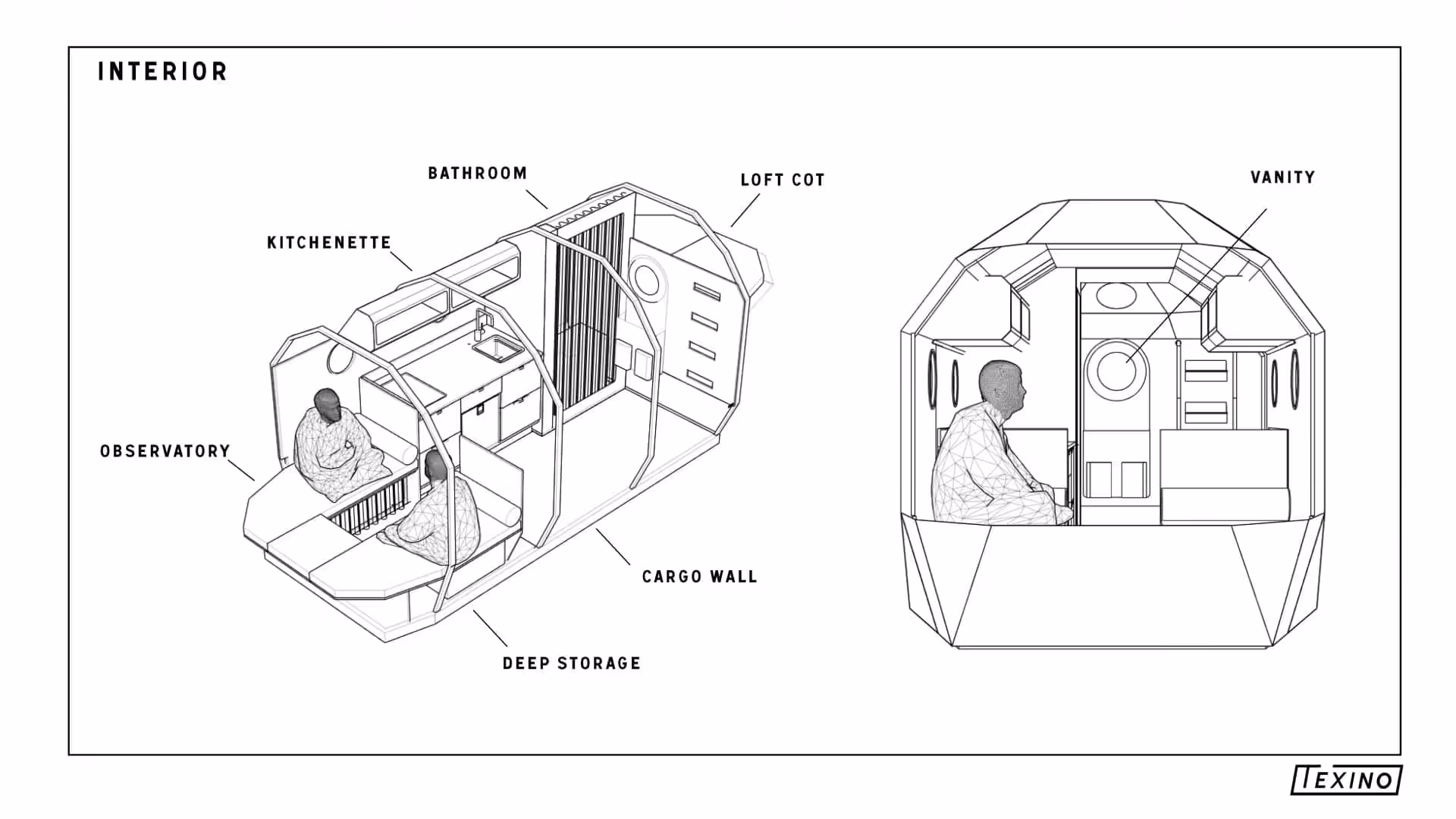 Texino says a large banquet table will convert into a king-sized bed but at this stage, the rendering is showing two single beds as well as a sleeping area over the cab. One can assume that these single beds are where the table converting king is.