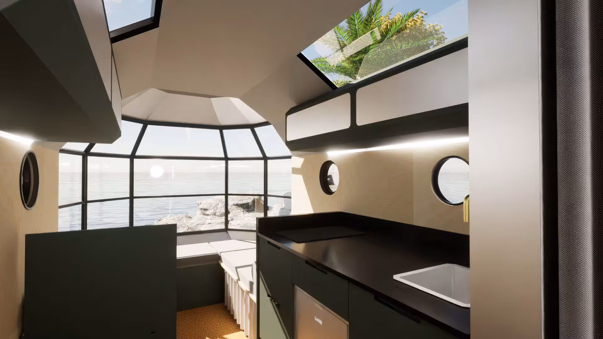 The whole upper-rear quarter is fully glassed for an atrium-like view. As mentioned earlier, the Smartglass windows allow for privacy with the flick of a switch. In addition to the large bay window, there are six portholes and two skylights.