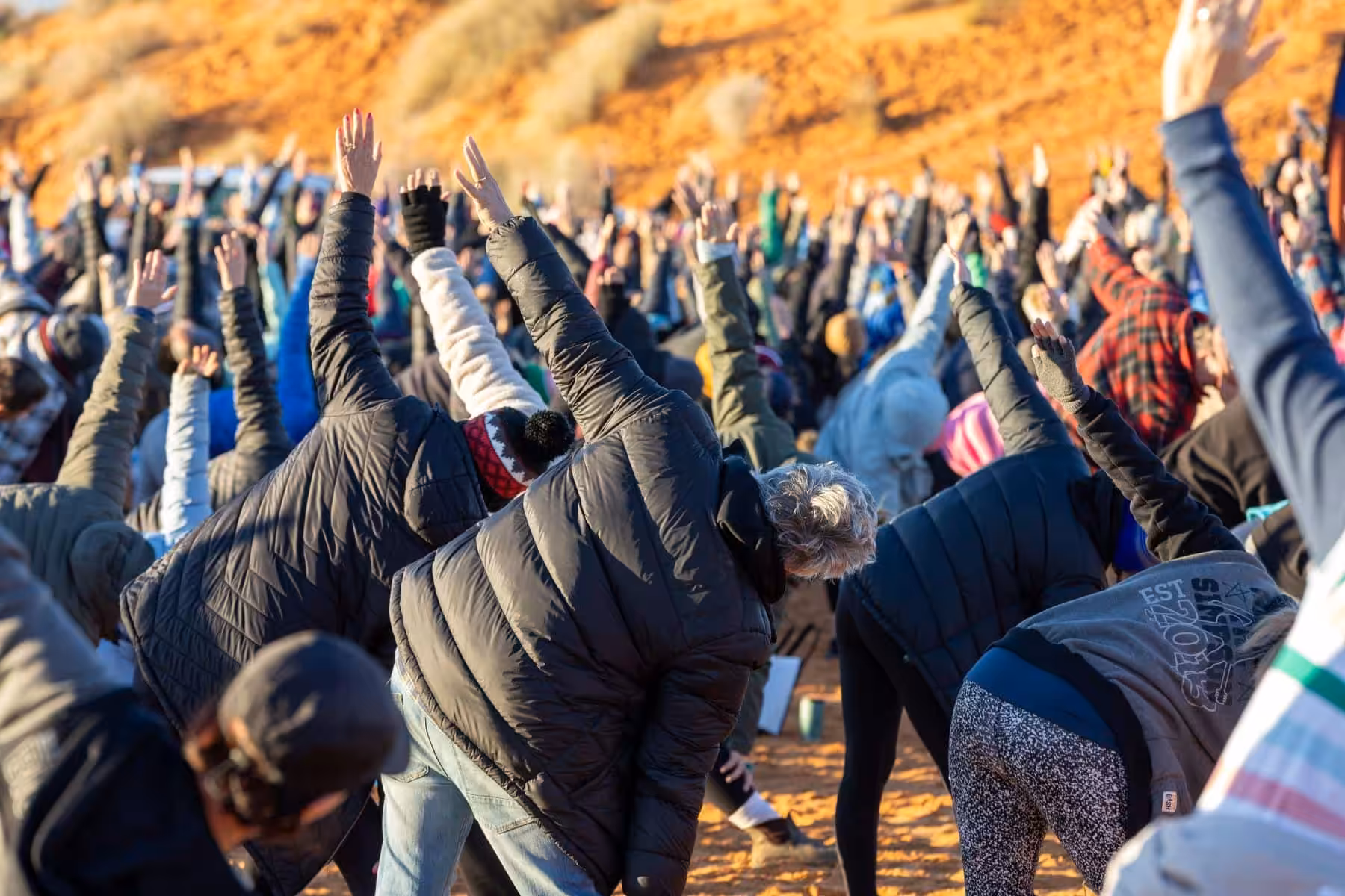At the Big Red Bash, 672 yogis did just that and broke a world record at the same time. Talk about the early bird catching the worm! On day two of the Outback festival, hundreds of attendees woke up to climb Big Red in an effort to engage in some picturesque yoga practice. 672 yogis got straight into their sun salutations, a well-known and commonly practised sequence of yoga typically performed at sunrise. Except this time, it was while overlooking a sea of red sand. This saw a new Australian record set for ‘The Most People Practicing Yoga on a Red Sand Dune.’