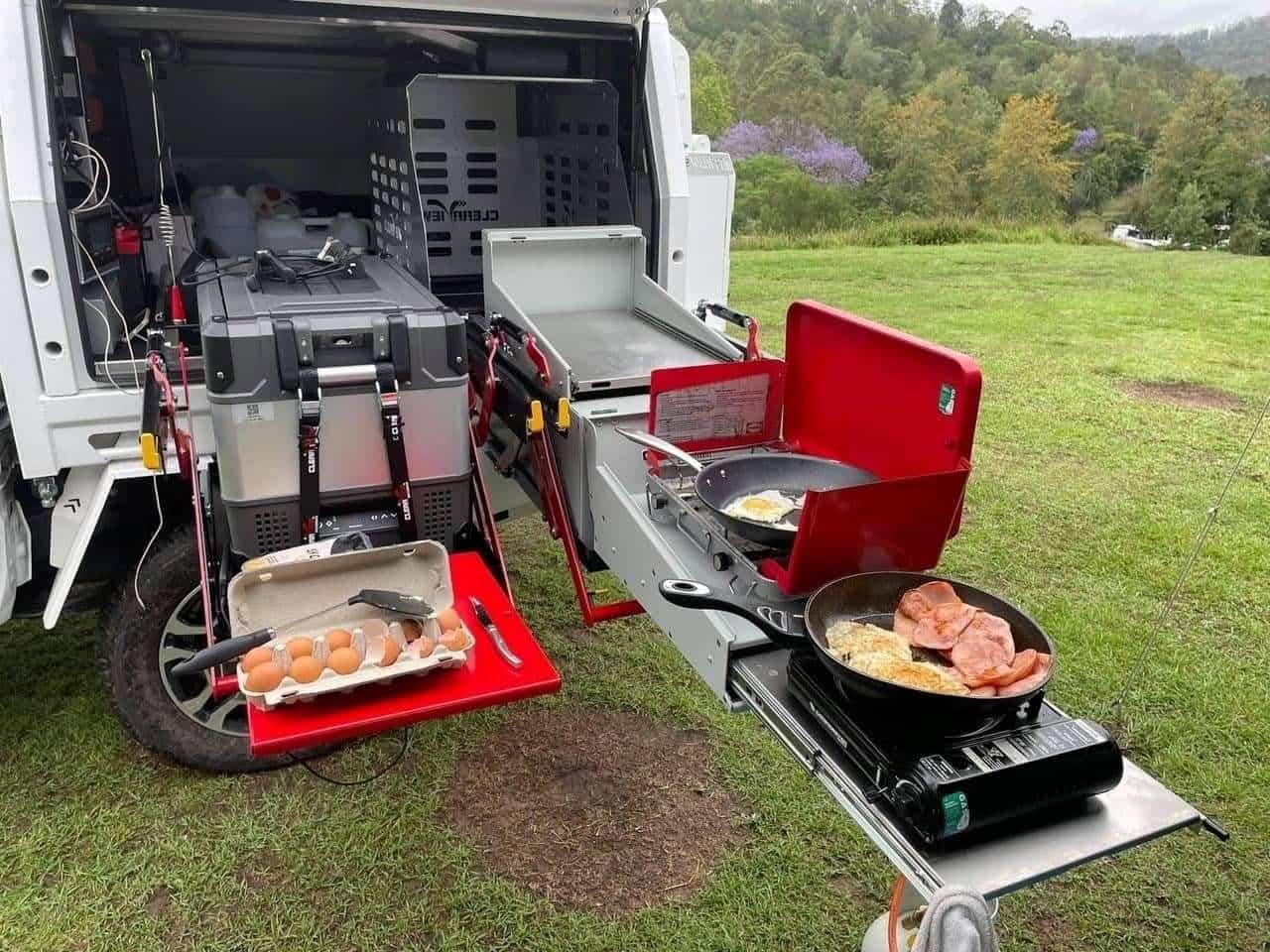 Leaning in the back of your wagon or reaching up to see inside the fridge mounted in your canopy wears thin very quickly. For the ultimate car kitchen, you’re going to want to improve your access with a fridge slide.
