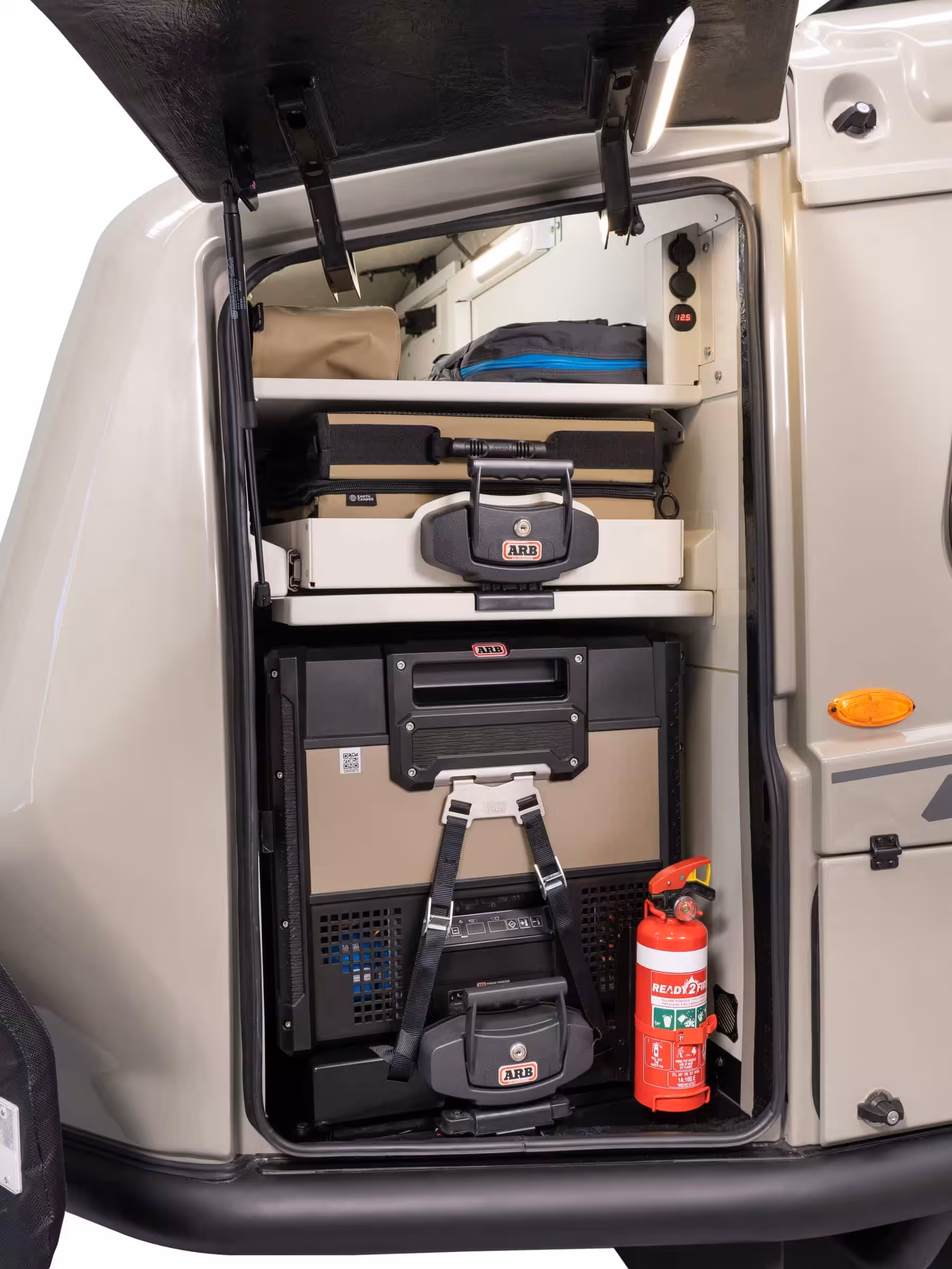 Other standard features include a rear wet storage locker, 2 x underbody mounted 70-litre fresh water tanks and 2 x 20L jerry cans. If all of these are utilised, this gives you a whopping 180L of potential water storage. Optional extras include a Webasto diesel heater, the Redarc Redvision System, a 2000W inverter, an additional lithium battery, an onboard air compressor, a Joolca portable hot water system and more.