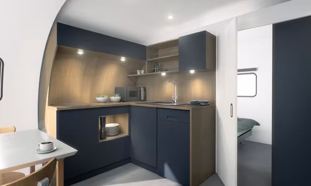 The Beauer 3XPlus is the largest offering at 28m2 of living space. It can accommodate up to six people and features two bedrooms. The living room features a convertible sofa and dining area and the kitchen includes a larger 230-litre refrigerator, sink and stove. There is even room for a dishwasher in this kitchen.