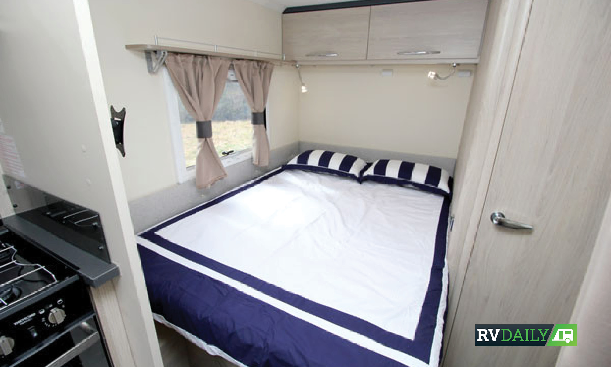 The kitchen, which is on the offside opposite the entry door, provides a reasonable amount of storage with lockers above the kitchen and two cupboards and a drawer under the bench. The bench has a small fold-out extension and a single-bowl mixer tap sink and a two hob/one hotplate cooktop. Australian vans will have a cupboard in place of the oven pictured. Up the back of the layout is the bedroom, with a double bed that hinges to reveal storage space, also accessed externally via an offside hatch.