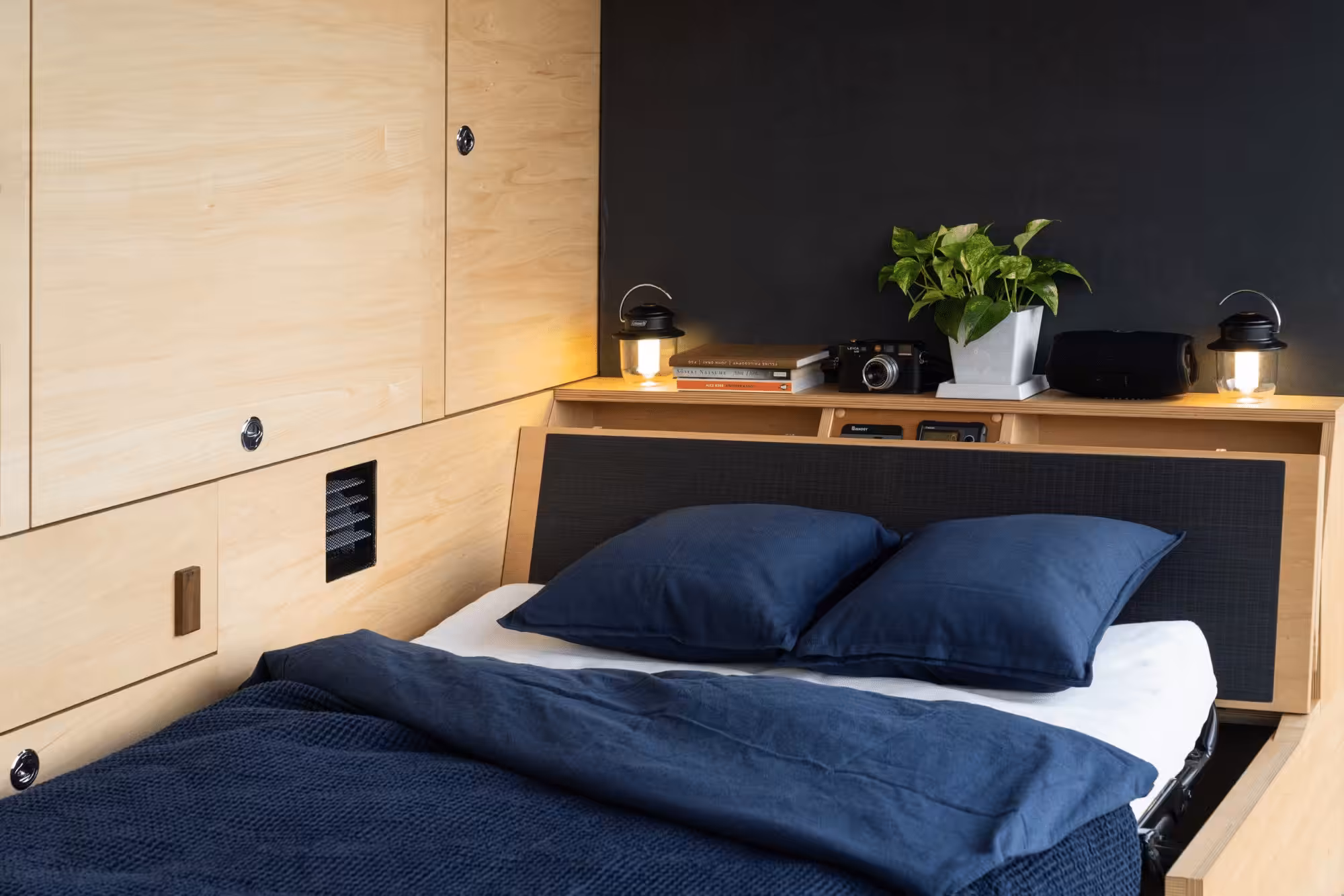 The kitchen features a walnut butcher block counter, tall faucet and portable induction cooktop. The shower room is in the rear corner beyond the kitchen, and is separated by a retractable accordion door. Once the working day ceases, the NOMADPro can be converted into night quarters. Your desk, monitor and any benches being used can be easily stowed away, and replaced by a bed that can be simply pulled out.