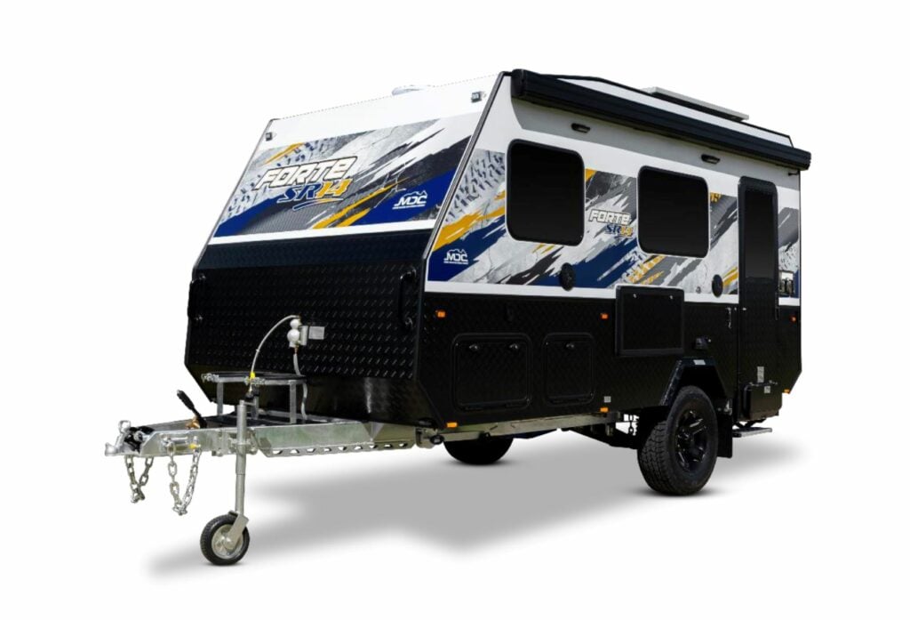 Starting off the six Forte SR model range, the SR14 is a compact, light and well-priced single axle tourer that looks like it could head onto the dirt without much trouble. With an east-west front bed, a centre kitchen/dining plus a rear sink/bench and rear corner ensuite, this is a compact layout with reasonable amenity. There are plenty of nice touches for the price, such as a Sirocco fan, wireless rear camera, as well as a good deal of power and water support for free camping.