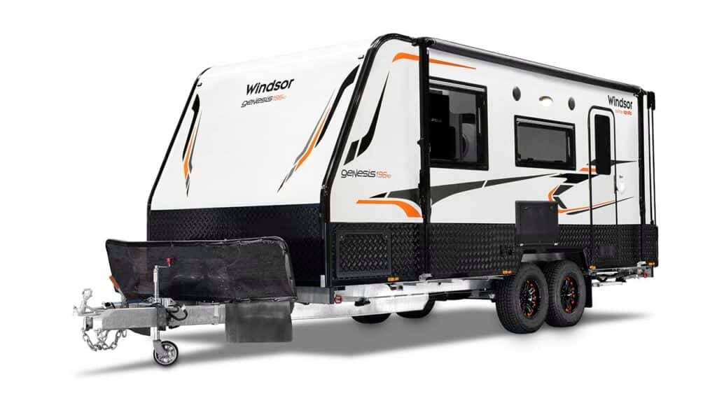 Just one of the four-model Genesis range (there are models ranging from a 17ft single axle two berth to a 22ft family four-berth bunk model) this two-berth Genesis 196RD tandem-axle model is a regular tourer for couples. The front bed, centre kitchen and dinette is complemented up back with an ensuite, and bonus standard features include a washing machine and leatherette upholstery. While not a full off-grid van as standard, there’s enough power to afford come time camping away from mains power. The body offers semi off-road capacity too, with the torsion bar independent suspension, checkerplate protection and an A-frame mounted front mesh stone guard.