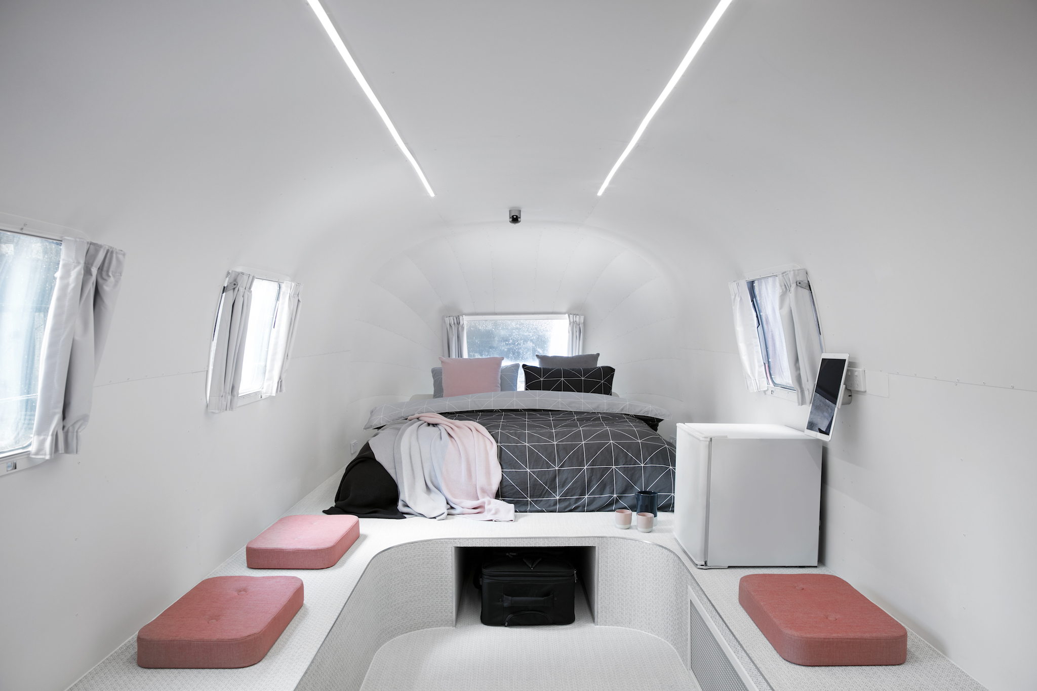 The ‘retro-futuristic’ interiors, designed by Melbourne-based architects Edwards Moore, are surprisingly comfy and spacious